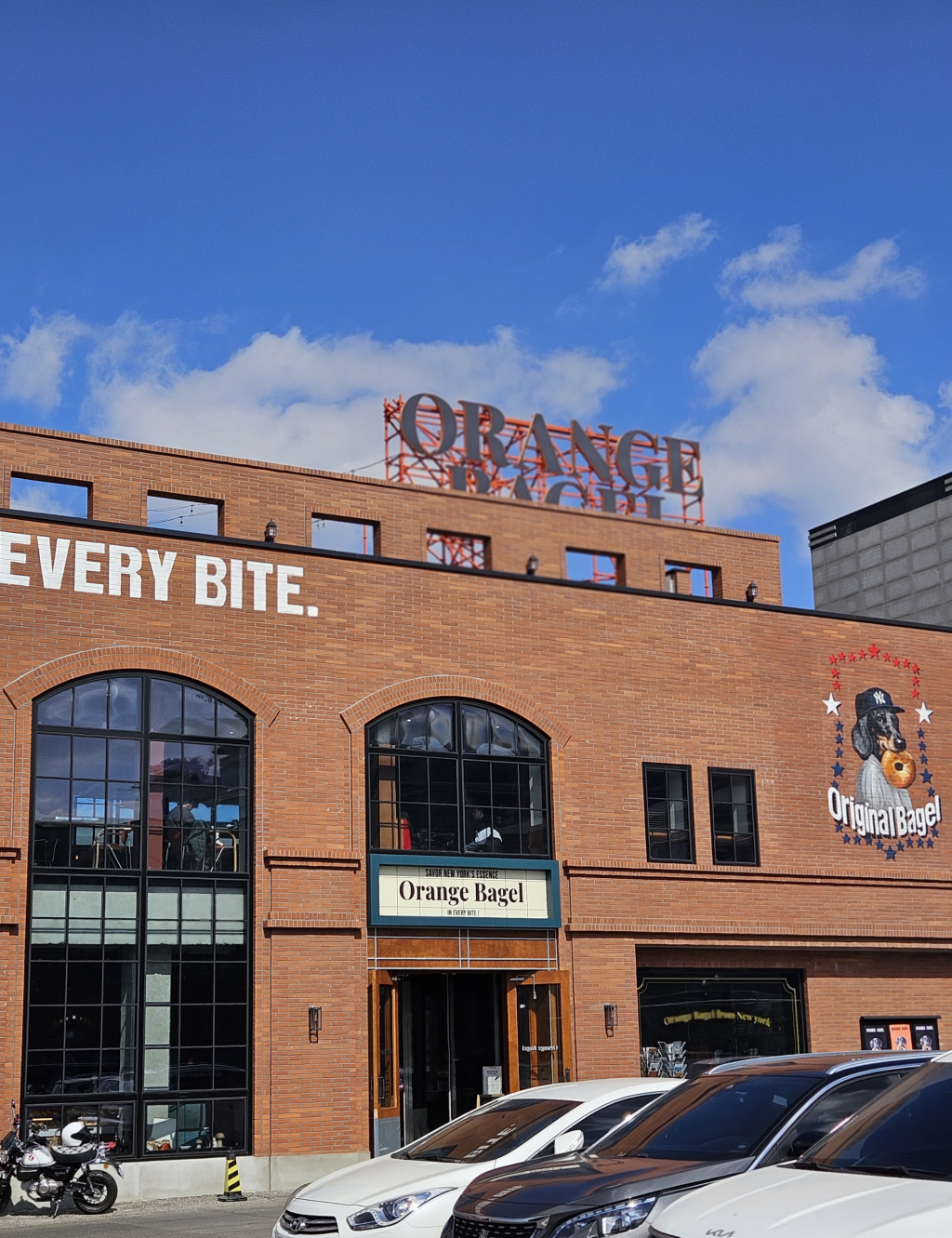 오렌지베이글 수원은 멀리서부터 시선이 확 가는 붉은 벽돌 건물이에요! 딱 봐도 이국적인 분위기! 미국 브루클린 감성을 그대로 옮겨놓은 듯한 외관에 벌써부터 카메라를 꺼내게 되더라고요. 이미 문 앞에서 핸드폰을 들어 사진을 찍었어요 :)