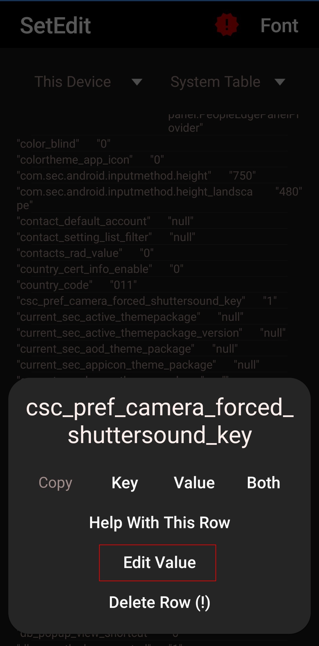 2) set edit 어플 실행 후 "css_pref_camera_forced_shuttersound_key" 찾아 값을 "1"에서 "0"으로 변경