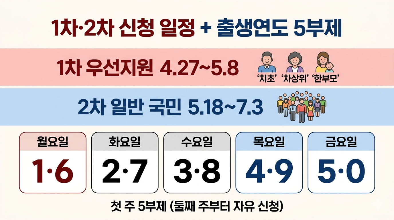 신청은 1차(우선지원)와 2차(일반)로 나뉘어 운영되며, 첫 주에는 시스템 과부하 방지를 위해 출생연도 끝자리에 따른 5부제 요일제가 적용됩니다.