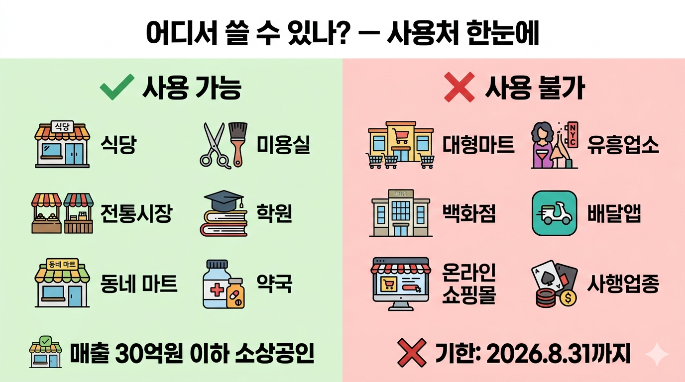 ⑦ 사용 가능 매장: 매출 30억원 이하 소상공인 (대형마트·온라인몰·배달앱 사용 불가)