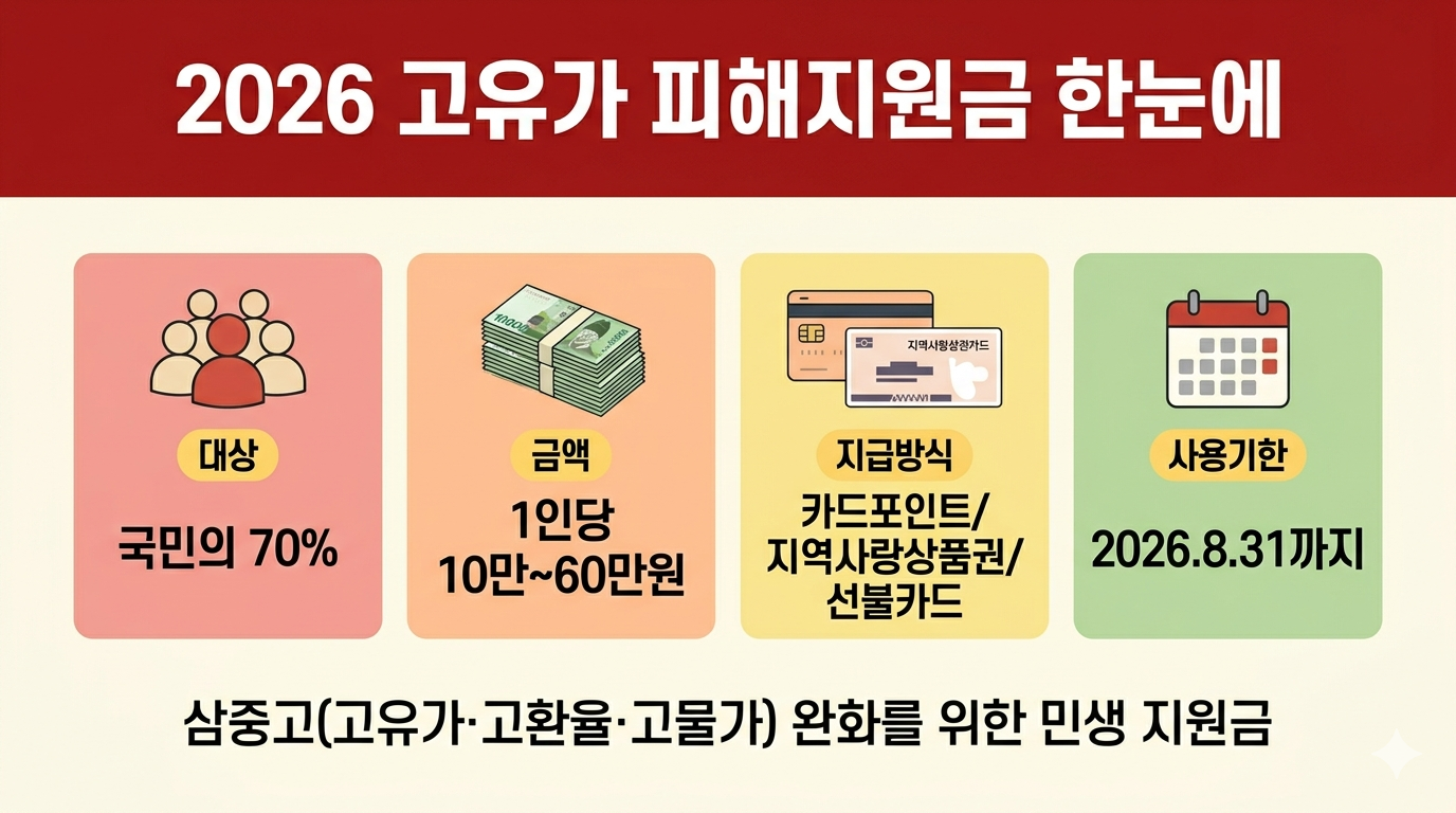 2026 고유가 피해지원금은 고유가·고환율·고물가의 삼중고로 어려움을 겪는 서민층의 생활비 부담을 줄이기 위해 행정안전부가 지급하는 민생 지원금입니다. 2025년 전 국민 지급과 달리 2026년은 소득 하위 70% 국민에게 집중 지원하되 취약계층일수록, 지방일수록 더 두텁게 주는 차등 구조로 설계되었습니다.