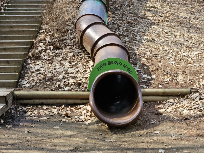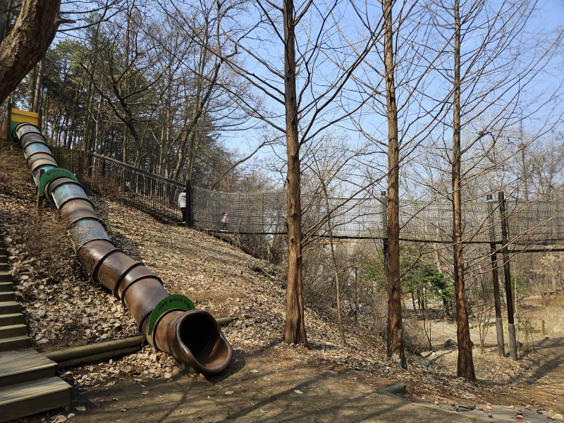 개인적으로 딸아이가 너무나 좋아했던 미끄럼틀이 있었던 공간인데요. 숲놀이터에서는 명칭이 잭과 콩나물로 불리고 있더라고요. 미끄럼틀이 꽤나 높습니다. 유아 아이가 혼자 타기에는 다소 위험한 부분이 있고 6세 이상정도면 그래도 혼자 충분히 즐길 수 있지 않을까 생각되는데 부모랑 같이 탈 수도 있으니 아이를 안고 같이 미끄럼틀을 타는 여러 가족들을 볼 수 있었습니다.
