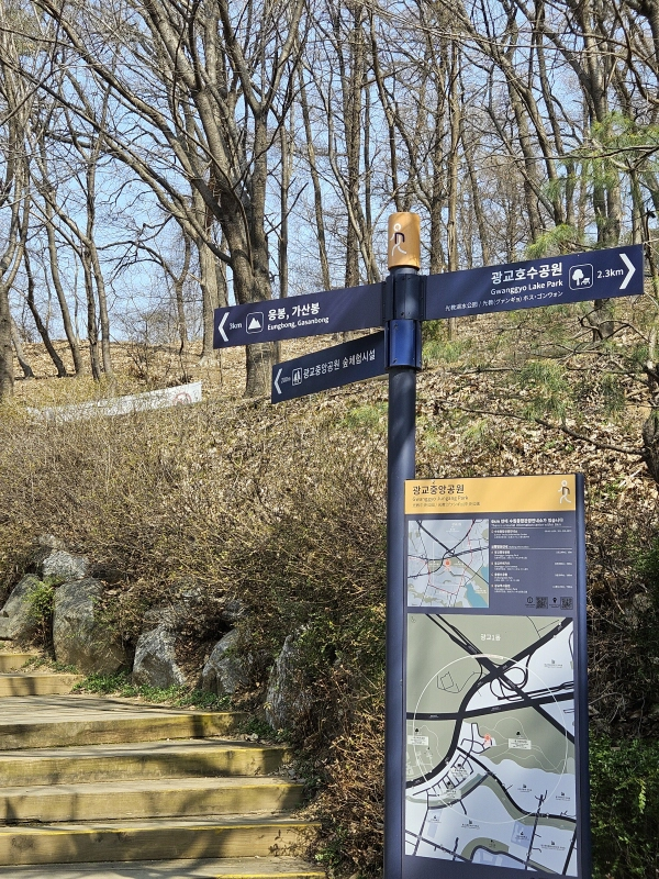 주차를 하시고 걸어 올라가시면 입구인 계단이 보이는데요. 계단으로 올라가면 광교호수공원에 들어서시는 거예요. 산이 가파르지는 않지만 킥보드 나 자전거는 위험해 보이니 가져가지 않는 것을 추천드리며, 유모차의 경우에는 길이 비포장도로가 아니라 그래도 다듬어져 있기 때문에 처음 입구의 계단만 따로 들고 가시면 내에서는 이용하시는데 괜찮습니다.
