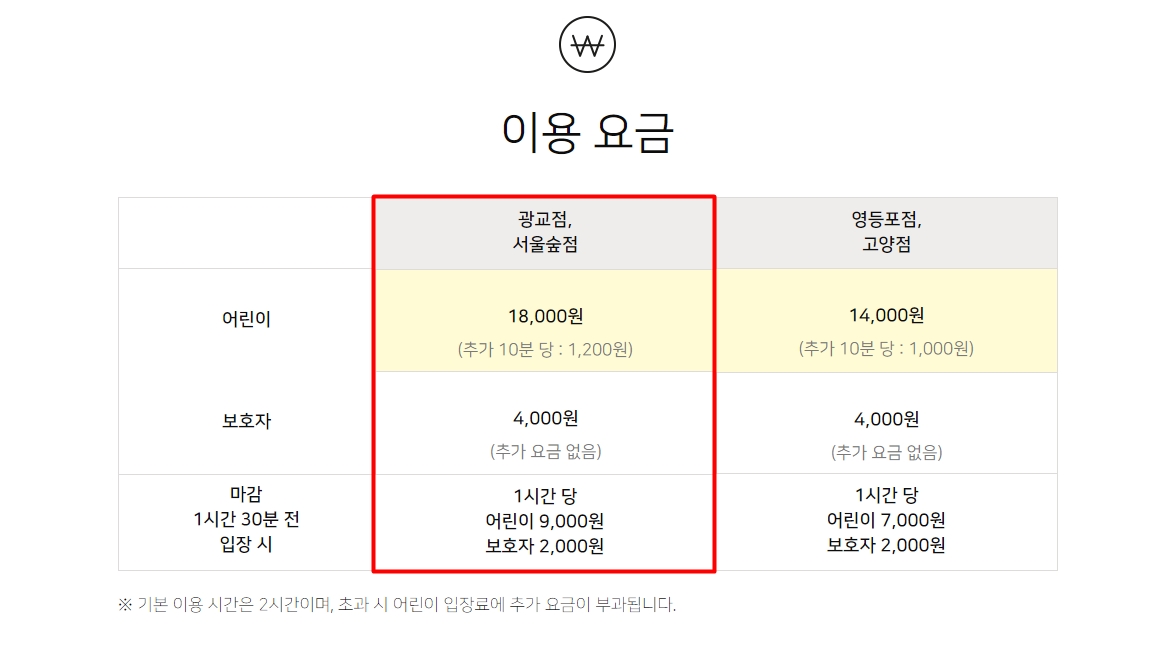 기본이용시간은 2시간이며, 어린이 18,000원 보호자 4,000원입니다. 추가 10분당 1,200원이 발생하며 보호자는 추가 요금이 적용되지 않으니 이용에 참고해 주세요.