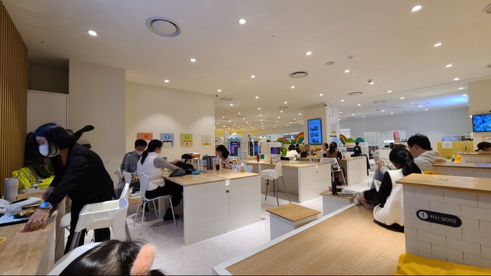 그리고 놀이공간 옆에는 식사하거나 앉아서 쉴 수 있게 자리가 마련되어 있는데 안 쉬고 놀겠다는 아이들은 놀게 놔두고 보호자는 앉아서 아기 노는 거 보며 쉴 수 있습니다 :) 좌식으로 이용할 수도 있고 테이블을 이용할 수도 있어요. 아기의자도 마련되어 있습니다.