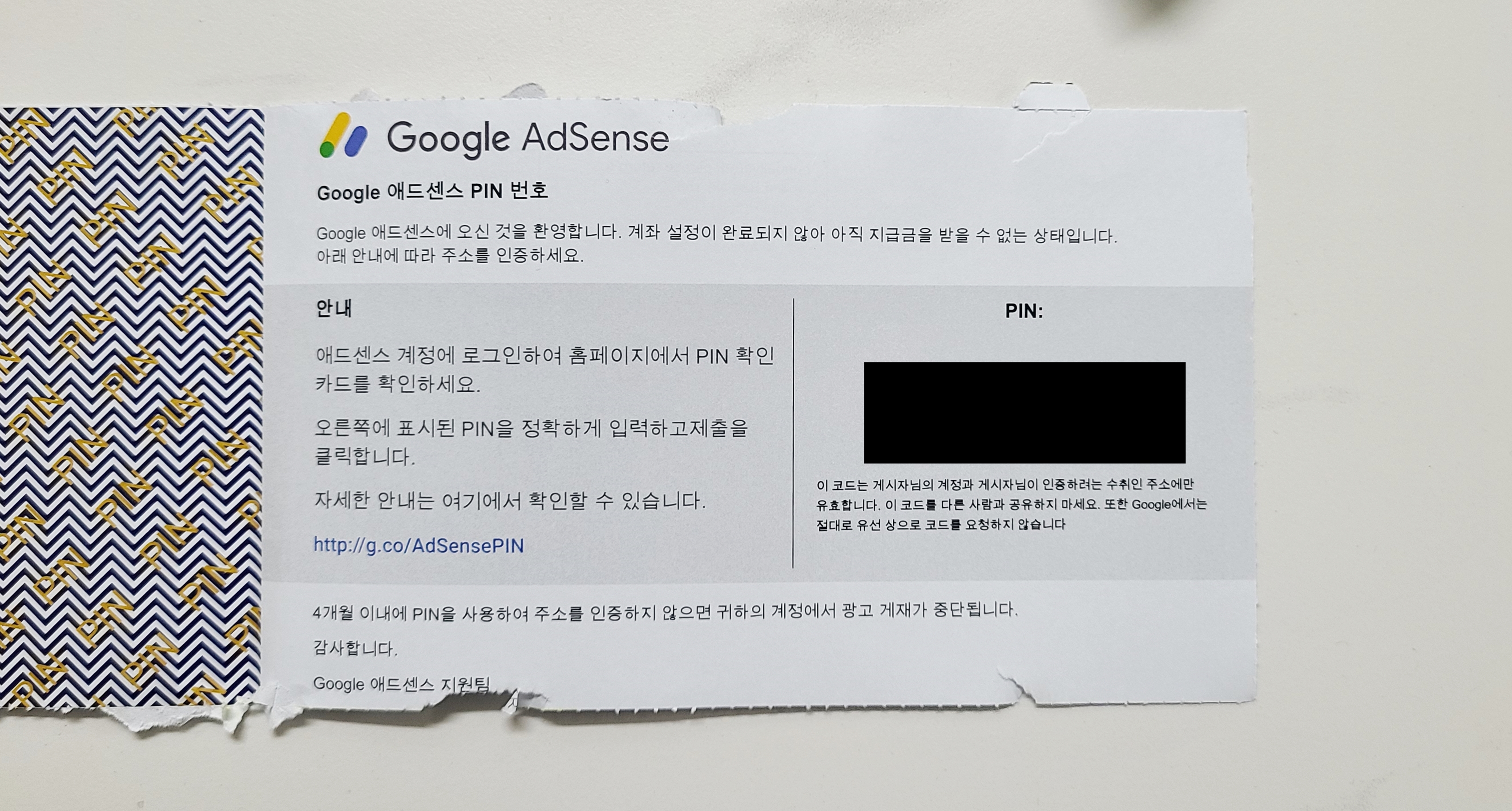 주소를 제대로 입력하셨다면 위와 같이 구글 애드센스 PIN 번호를 우편으로 받게 될 텐데요. 크게 확인할 사항은 없지만 입력 시 주의할 부분이 정확하게 입력을 해 주셔야 한다는 것입니다.