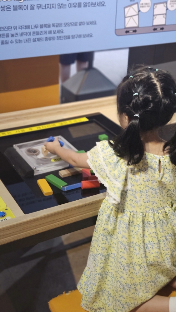 특히 저희 아이가 좋아했던 것으로 이야기드리면, 토네이도 체험 코너로 미니 토네이도를 만들어볼 수 있는 공간인데 좋아했었고, 굴러가는 시계 그리고 균형 잡기 등 좋아했어요. 특히 사진에 보이는 블록 쌓기는 지진체험인데 이것도 아이가 굉장히 잘 가지고 놀았습니다. 아이가 자연스럽게 체험하다가 집중하는 공간이 있을 거예요! 그 공간에서 놀면 됩니다. 과학탐구관이 단순하게 전시가 아니고 놀이처럼 즐기는 교육 공간이라서 더 좋았던 것 같아요.