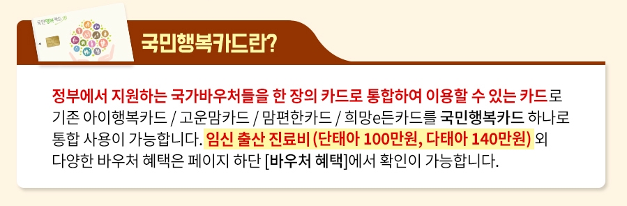 아기집을 확인한 날 산부인과에서 국민행복카드를 발급받으라는 안내를 해줍니다. 임신/출산 진료비 지원으로 단태아는 100만원, 다태아는 140만 원까지 지원받을 수 있어요. 분만 취약자는 20만원이 추가 지원된다고 하니 참고하세요.