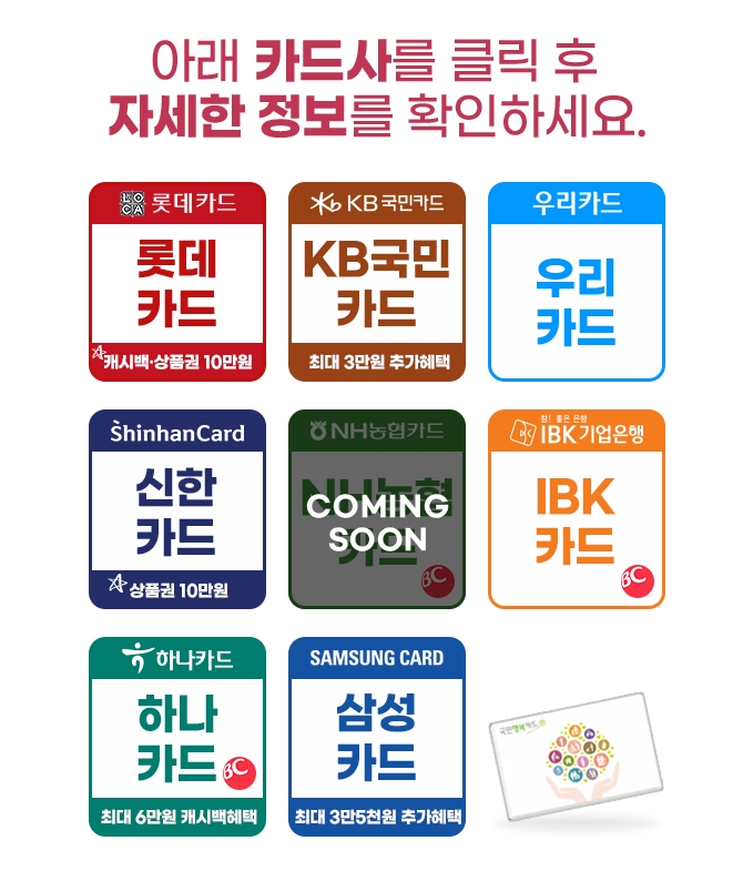 해당 배너를 클릭하신 후에 순차적으로 진행하면 되는데요. 카드사별로 다양한 혜택들을 제시하고있는데,