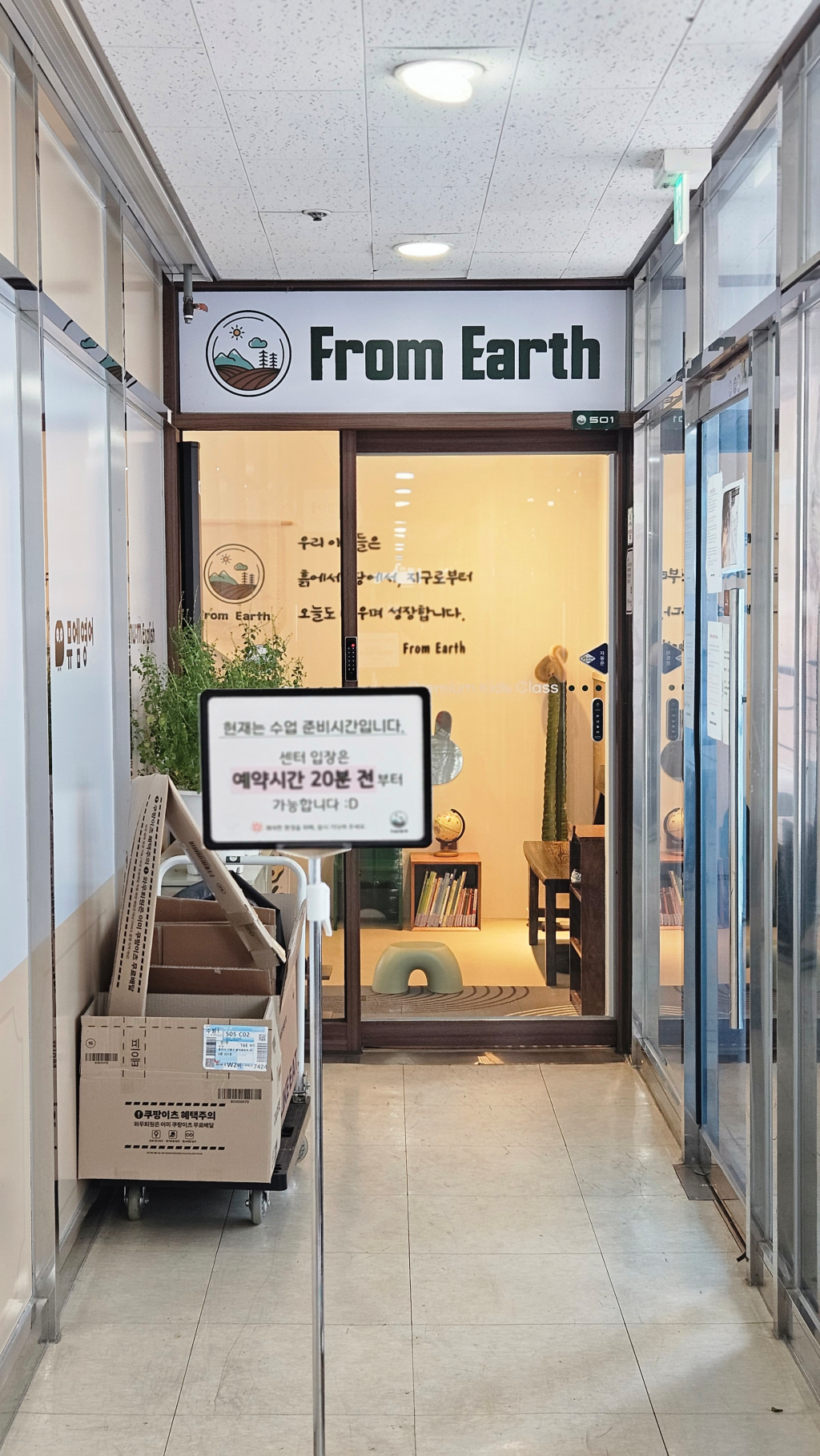 5층 엘리베이터 문이 열리면 바로 프러엄스 입구가 보이는데요. 문 앞에 20분 전 입장 가능하다고 되어있더라고요.