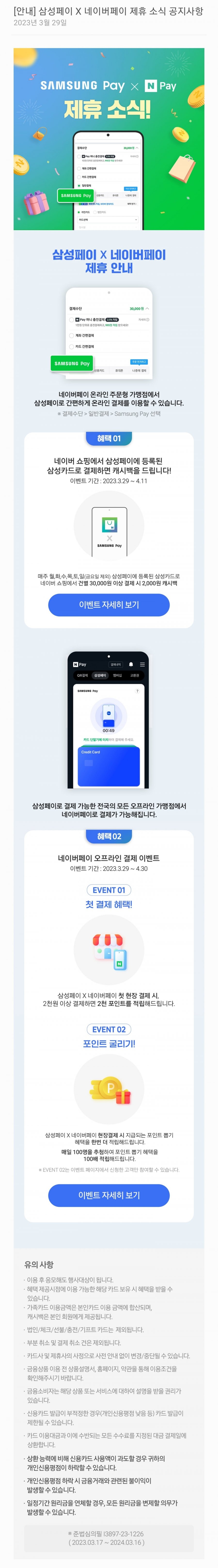 자세한 내용은 아래 이미지를 통하여 확인하실 수 있으며, 네이버페이 X 삼성페이 이벤트 혜택을 누리시길 바랍니다 :)