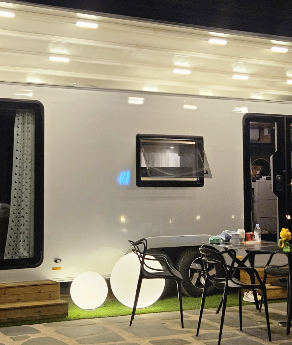 먼저 카라반이여서 아이 입장에서는 아지트처럼 느껴져서 더 좋았던 것 같아요. 무엇보다 청결 상태가 굉장히 만족스러웠어요. 바닥, 침구, 욕실까지 깔끔하게 정리되어 있었고, 주방 도구나 식기류도 잘 갖춰져 있어서 별도로 준비해 간 건 거의 사용하지 않았어요. 에어컨, 냉장고, 전자레인지, 전기포트 등 기본적인 가전제품도 모두 구비되어 있어서 마치 작고 아늑한 집처럼 느껴졌답니다.