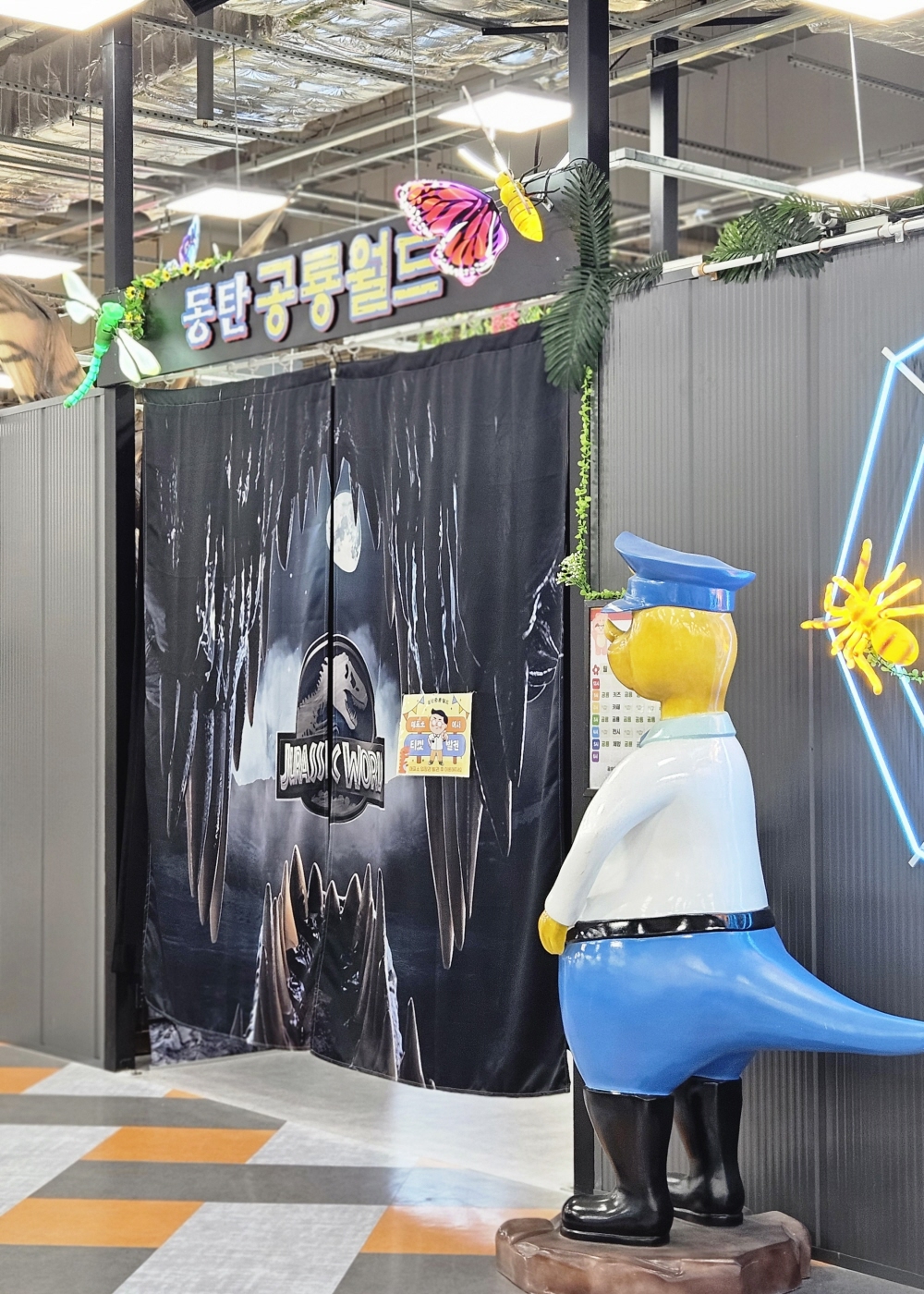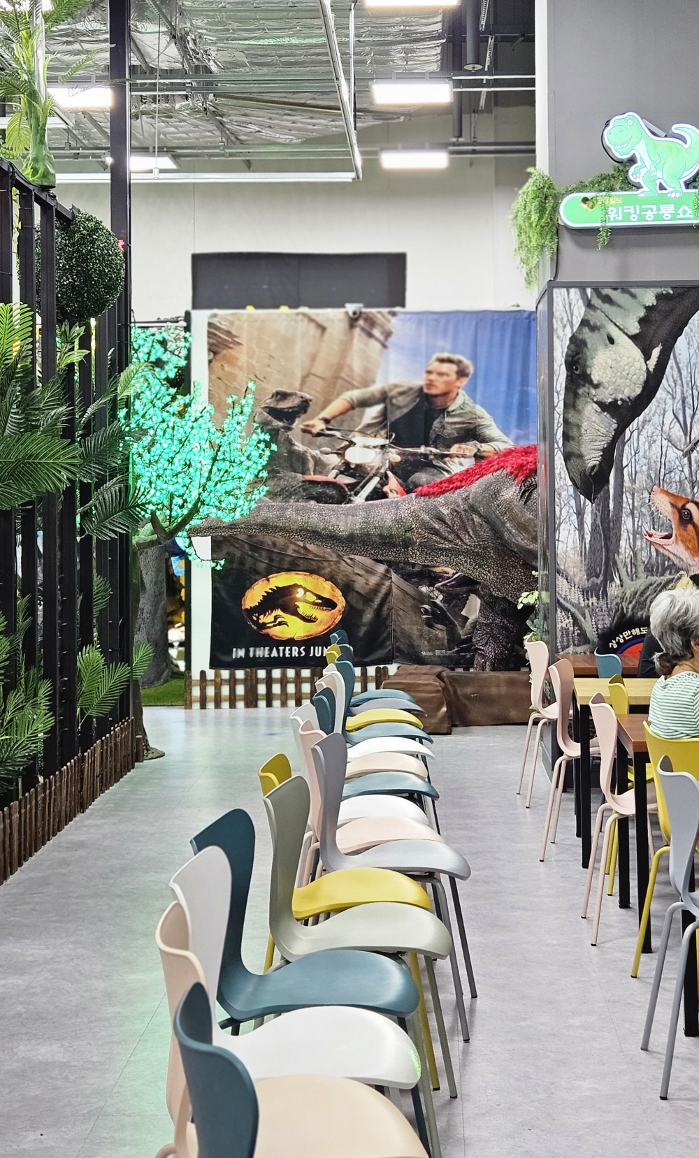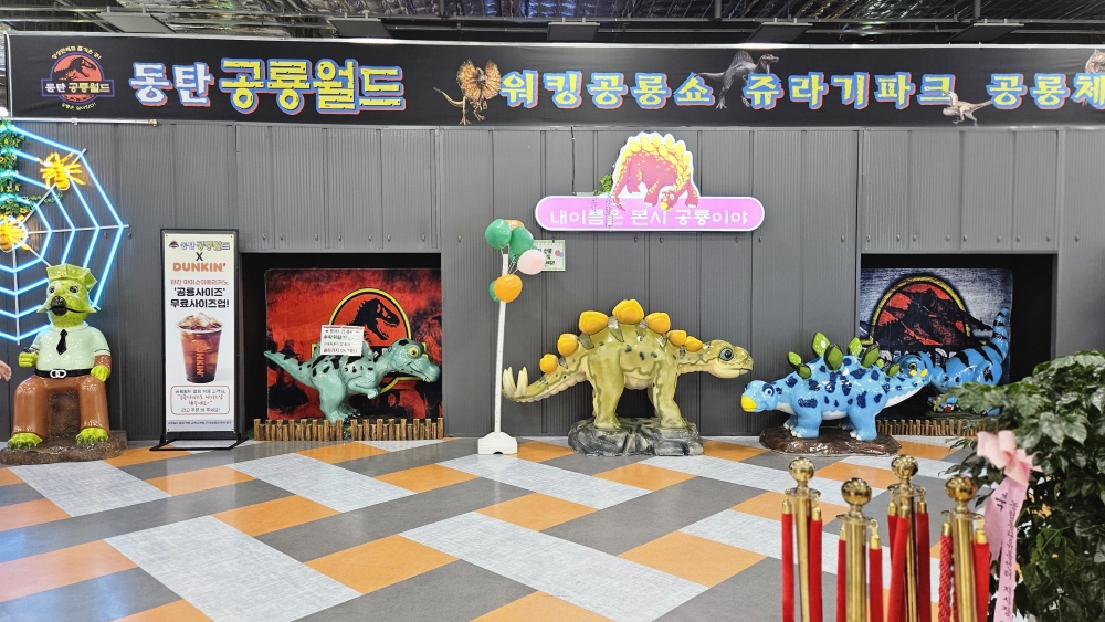 입구부터 이미 공룡 세계로 들어온 느낌이에요~!! 스테고사우루스 조형물이랑 쥬라기 월드 느낌의 간판이 있어서 들어가기도 전부터 아이들이 신나서 난리가 났어요 ㅎㅎ 그리고 입구 쪽에 던킨도너츠 콜라보로 아이스 아메리카노 공룡사이즈 무료 사이즈업 이벤트도 진행하고 있었어요~! 자세한 건 현장에서 확인해 보세요 :)