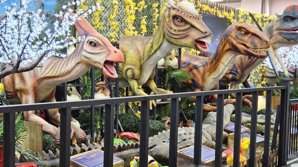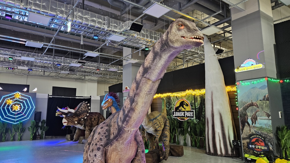 - 공룡 전시관 — 이름표까지 달린 대형 공룡 모형 전시, 포토존 가득