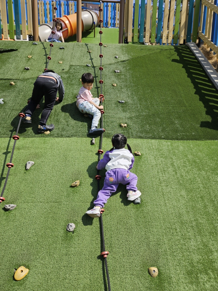 또한 클라이밍 사이로 줄이 매달려있어서 조금이라도 아이들의 안전에 도움이 되기 때문에 조금 더 안심이 되었습니다. 이 외에도 짚라인이라던지 네트모험놀이대 등 다양하게 할 것들이 많이 있는 신천리 참여형어린이놀이터 가까운 거리에 있다면 동탄 아기랑 갈만한 곳으로 추천드려볼게요.