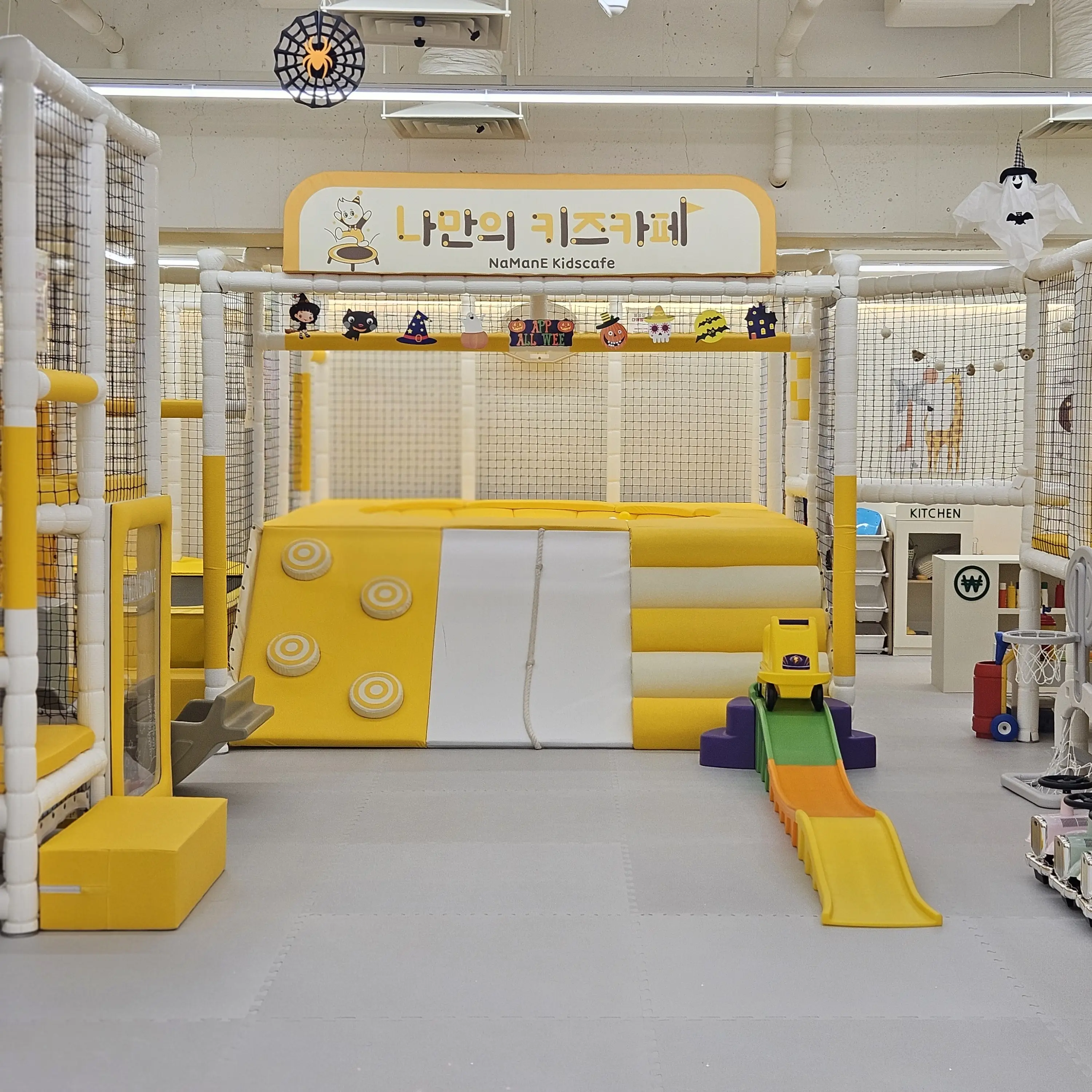 - 대형 정글짐 & 볼풀장 깊이 있는 볼풀장과 다양한 기어오르기 챌린지로 아이들의 신체 활동에 딱! 짚라인, 풍차돌리기 같은 활동적인 놀이도 있어서 7살 아이들도 신나게 뛰어놀았어요.