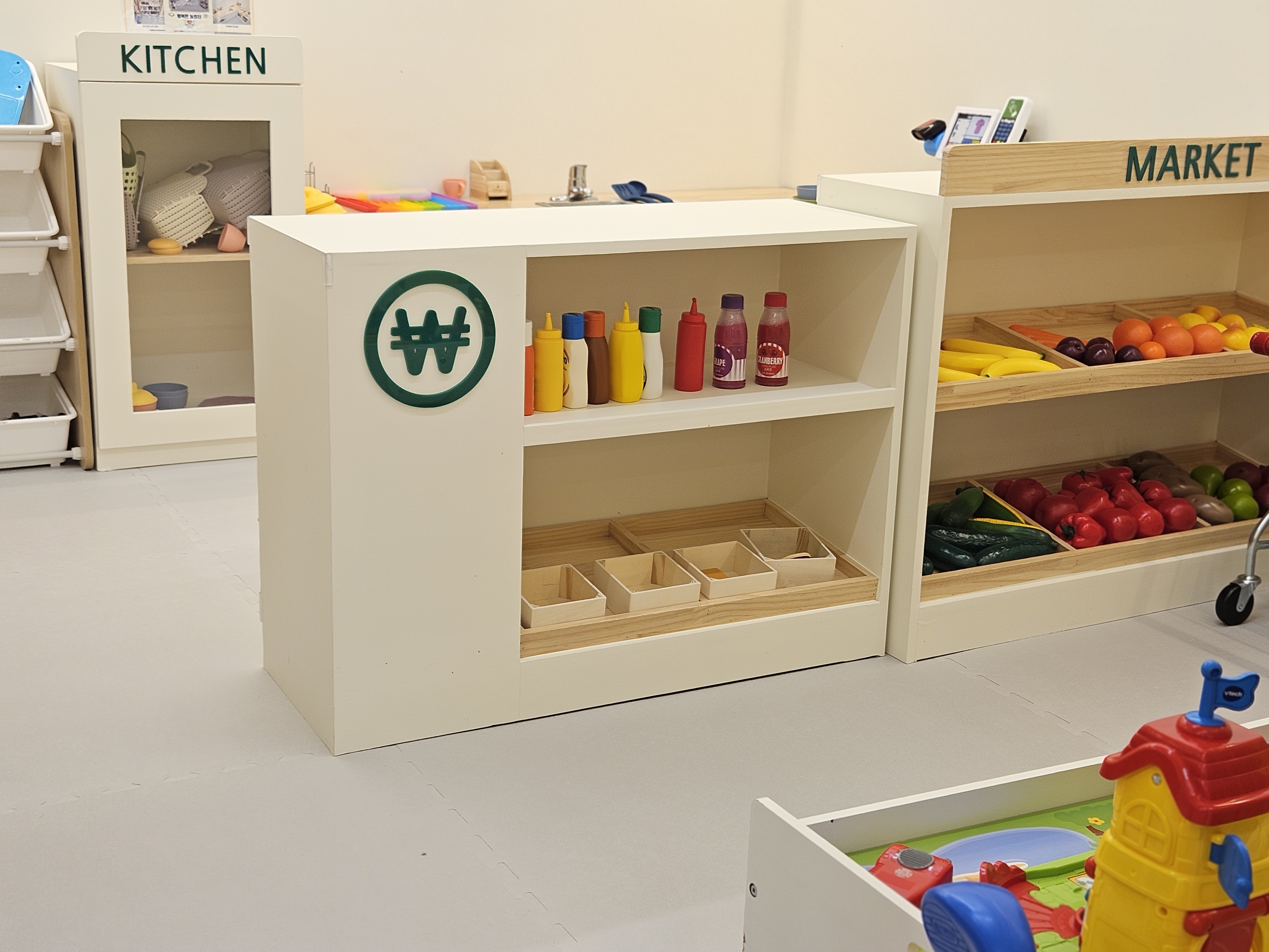 - 다양한 장난감들 주방놀이 & 마트놀이가 있어 여자아이들에게 인기 만점! 원목 소재로 안전하게 놀 수 있었고 붕붕카 & 자동차존이 있어 자동차를 좋아하는 아이들이 최고로 좋아하는 공간이었답니다! 또 낚시놀이하는 곳도 있어 서로 승부욕을 불태우며 재미있게 놀았어요!