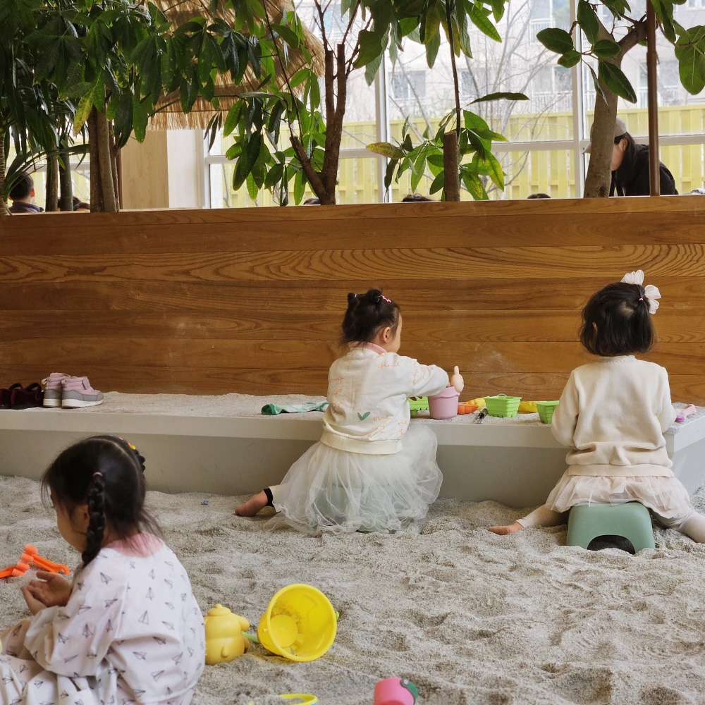 모래놀이터를 주변으로 의자와 식탁이 있어 앉은 상태에서 아이들을 확인하실 수 있습니다. 아기의자도 마련되어 있어 편하게 앉아 지켜볼 수 있었고 놀이 후엔 바로 씻길 수 있도록 세면대도 설치되어 있었어요.