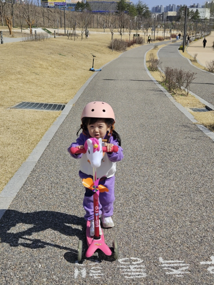 다만 씽씽이놀이터 아닌 신천지를 둘러싼 둘레길을 이용하여 킥보드를 탄다고 하시면 아이가 떨어질 위험도 있으니 부모가 주의 깊게 보셔야 하기 때문에 안전을 위해서는 씽씽이놀이터를 이용하여 타시는 것을 권고드립니다. 킥보드뿐만 아니라 자전거 트랙도 같이 있어서 아이와 함께 자전거 타기에도 좋은 곳이에요.