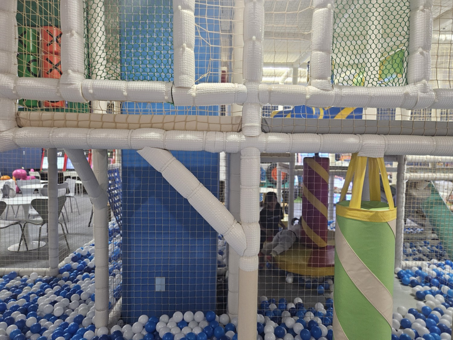 대형 볼풀장은 아이들이 스트레스를 풀고 에너지를 마음껏 발산할 수 있는 곳이었어요! 특히 미끄럼틀과 대형 정글짐이 함께 있어 모험심이 많은 아이들이 이곳저곳 탐험하기에 아주 좋더라고요. 저희 딸래미도 친구와 함께 대포를 쏘며 신나게 놀았어요! 또, 생선 모양의 쿠션 위에 올라가 배처럼 타고 놀이도 하고, 화면 속 몬스터들을 물리치는 게임도 즐겼어요. 아이들이 화면을 보고 즐겁게 반응하는 모습이 정말 재미있었어요! 대형 볼풀장 옆에는 사진처럼 부모들이 쉴 수 있게 탁자와 의자가 배치되어 있어서 아이들이 노는 모습을 편하게 즐길 수 있어 좋았어요!