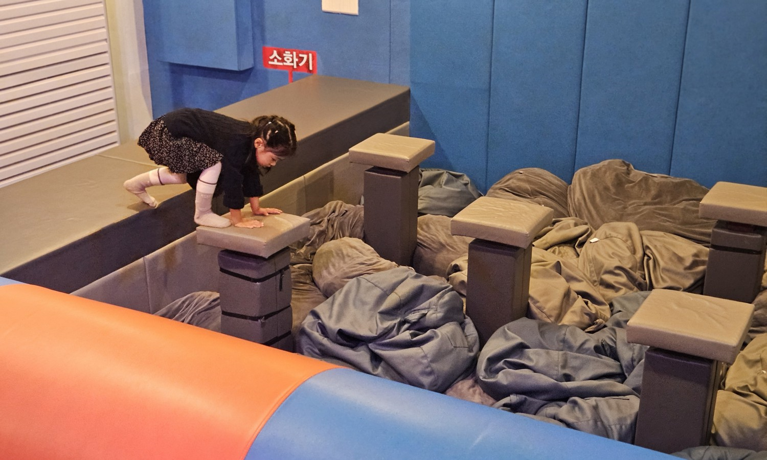 특이하게도 닌자코스가 있었는데 균형 감각과 대근육 발달에 좋은 공간이었어요! 특히 이곳의 공간은 아이들이 액티비티 하게 놀 수 있는 공간이어서 아이가 엄청 즐겨서 놀았던 것 같아요. 그리고 아이들이 좋아하는 트램폴린에서는 신나게 점프하면서 재미있게 놀았어요! 클라이밍존도 있었지만 아직 아이가 4세여서 클라이밍을 하기에는 무리라 이용하지는 못했지만 클라이밍을 하는 친구들이라면 너무 재미있게 놀 수 있을 것 같았어요!
