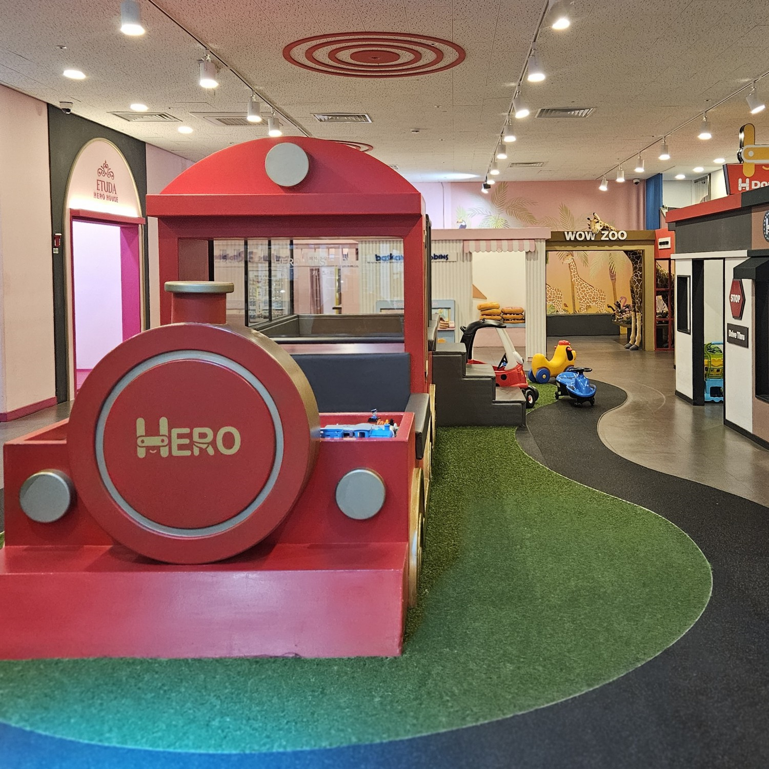 주차타워도 여러 개 있어서 아이들끼리 사이좋게 주차놀이를 할 수 있었어요. 복도에는 도로가 깔려 있어서 붕붕카를 타고 도로를 따라 달려보기도 했어요. 붕붕카는 주말에 방문할 경우 아이들이 많이 돌아다니기 때문에 부모님들께서는 주의를 기울여 보시는 게 좋을 것 같아요! 안전이 가장 중요한 만큼요. 또, 아이스크림 가게 컨셉의 놀이 공간도 있었고, 화장품 가게 컨셉의 놀이 공간도 있었는데 아이가 정말 재미있게 놀았어요! 딸래미 아들래미 할 것 없이 재미있게 놀 수 있는 공간이었어요!