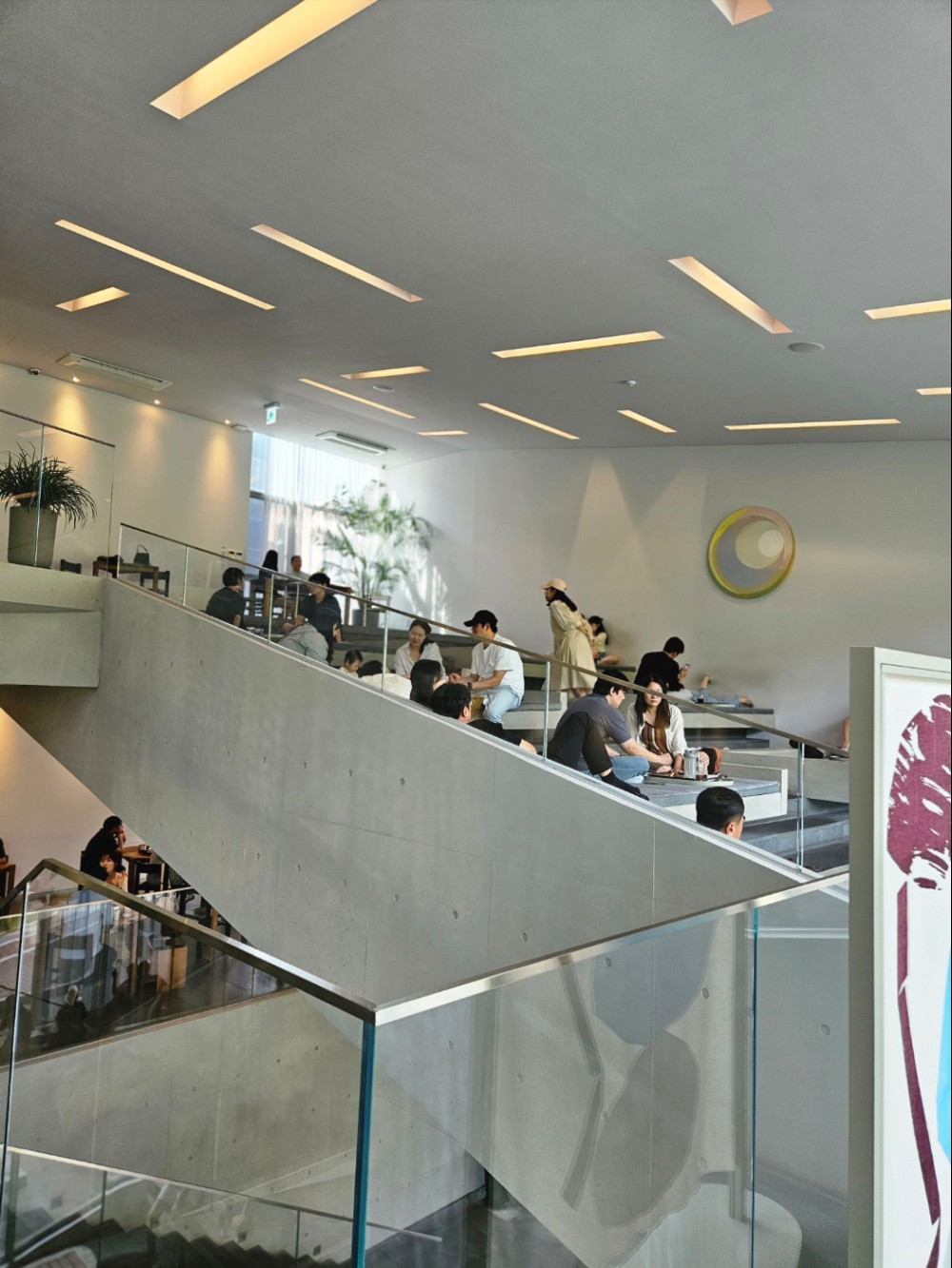 제가 추천드린 1층의 단상 외 또 추천드리는 곳은 3층의 좌식으로 앉을 수 있는 공간입니다. 이 공간은 앉는 자리의 공간이 매우 넓고 계단식 구조로 되어있어 통창유리를 바라보며 대화를 나누고 커피를 즐길 수 있는데요.