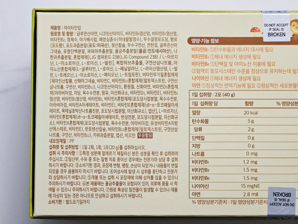 마이타민 업에 포함된 성분은 비타민B1, 비타민B2, 비타민B6, 판토텐산, 나이아신과 함께 여러 미네랄과 아미노산, 아연이 주 성분으로 이루어져있는 제품입니다.