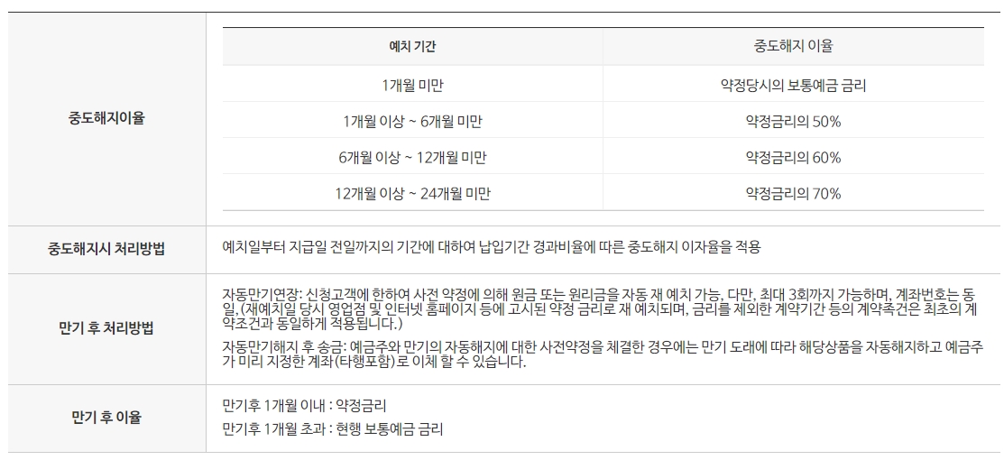 2) 만기 후 처리방법 - 자동만기연장: 신청고객에 한하여 사전 약정에 의해 원금 또는 원리금을 자동 재 예치 가능. 다만, 최대 3회까지 가능하며, 계좌번호는 동일.(재예치일 당일 영업점 및 인터넷 홈페이지 등에 고시된 약정 금리로 재 예치되며, 금리를 제외한 계약기간 등의 계약조건은 최초의 계약조건과 동일하게 적용됩니다.)