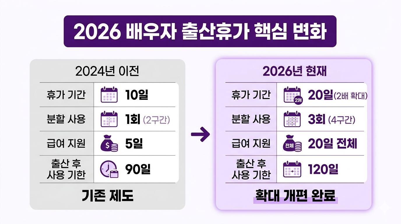 2025년 2월 23일 시행된 개정안에 따라 배우자 출산휴가 제도가 대대적으로 강화되었습니다. 2026년에는 그 개편 내용이 안정적으로 운영되고 있으며, 가장 중요한 4가지 변화는 다음과 같습니다.