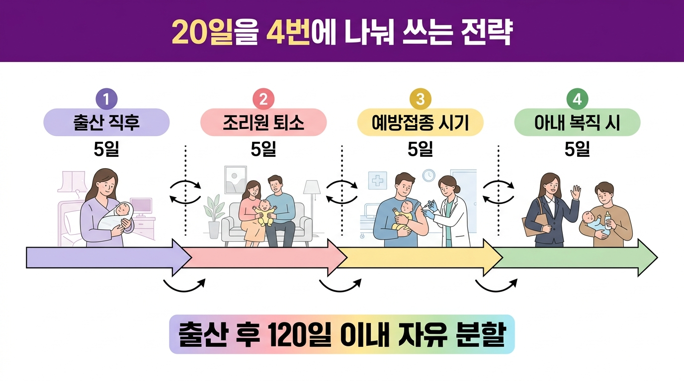 2025년 개정으로 분할 사용이 1회(2구간) → 3회(4구간)로 확대되어 훨씬 유연하게 활용할 수 있습니다. 출산 직후·조리원 퇴소·예방접종·아내 복직 시기에 맞춰 전략적으로 나눠 쓰는 것이 핵심입니다.