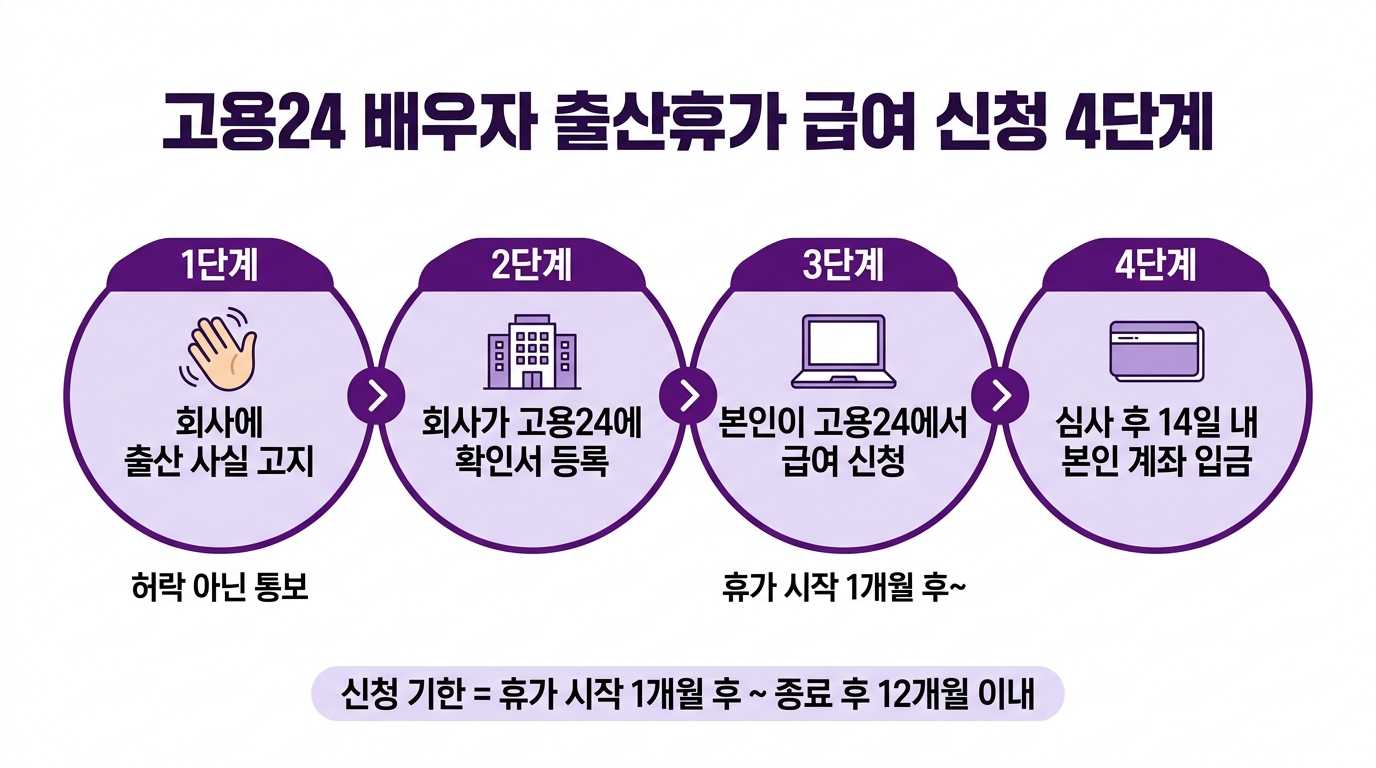 신청은 회사 고지 → 사업주 확인서 등록 → 본인 급여 신청 → 입금의 4단계로 진행됩니다. 2024년부터 고용보험(ei.go.kr)이 고용24(work24.go.kr)로 통합되어 모든 신청은 고용24에서 처리됩니다.