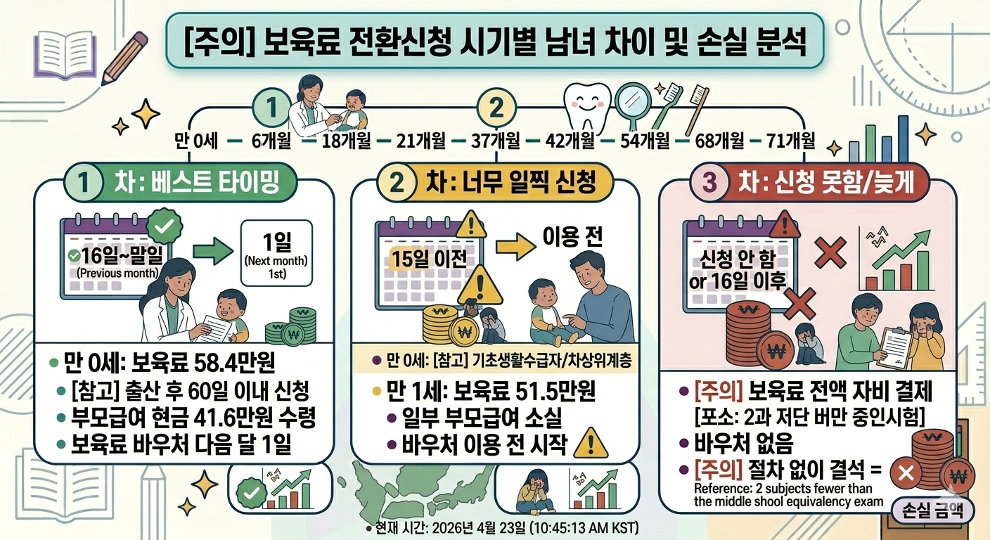 보육료 전환신청에서 매월 15일은 당월 적용과 익월 적용을 가르는 기준일입니다. 이 날짜를 기준으로 손실 금액이 크게 달라집니다.