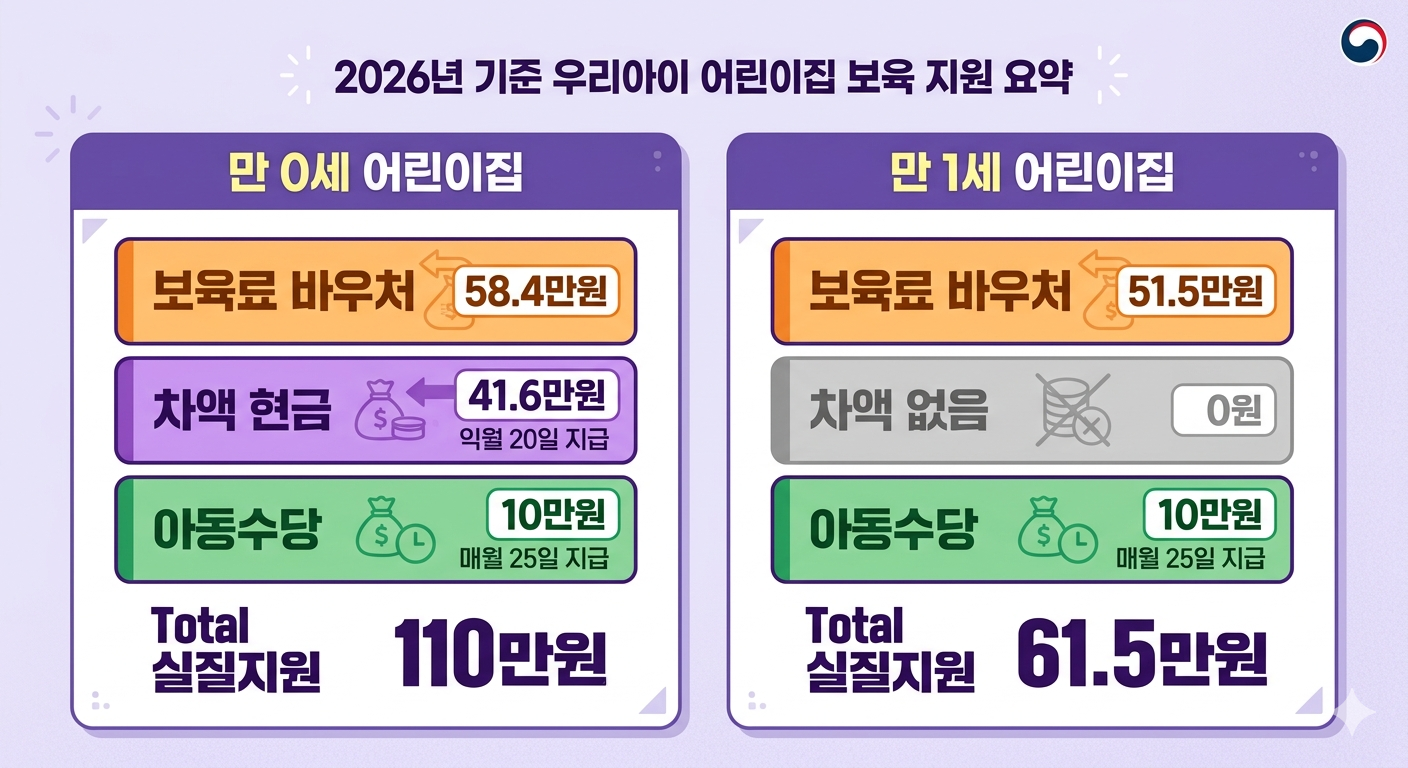 | 보육료 바우처 (어린이집 지급) | 58만 4천원 | 51만 5천원 |