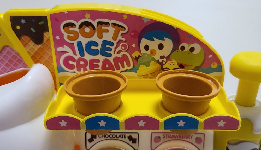 사용방법은 다섯 가지 아이스크림 맛 중에 원하는 아이스크림 맛을 고른 다음에 아이스크림 위에 시럽과 토핑도 올릴 수 있습니다. 레버를 당겨 아이스크림을 콘에 올릴 때는 뽀로로 노래들이 다양하게 흘러나와서 그런지 아이가 너무 좋아하더라고요. 특히 레버를 당길 때는 춤까지 추면서 당기는 모습을 보실 수 있습니다.