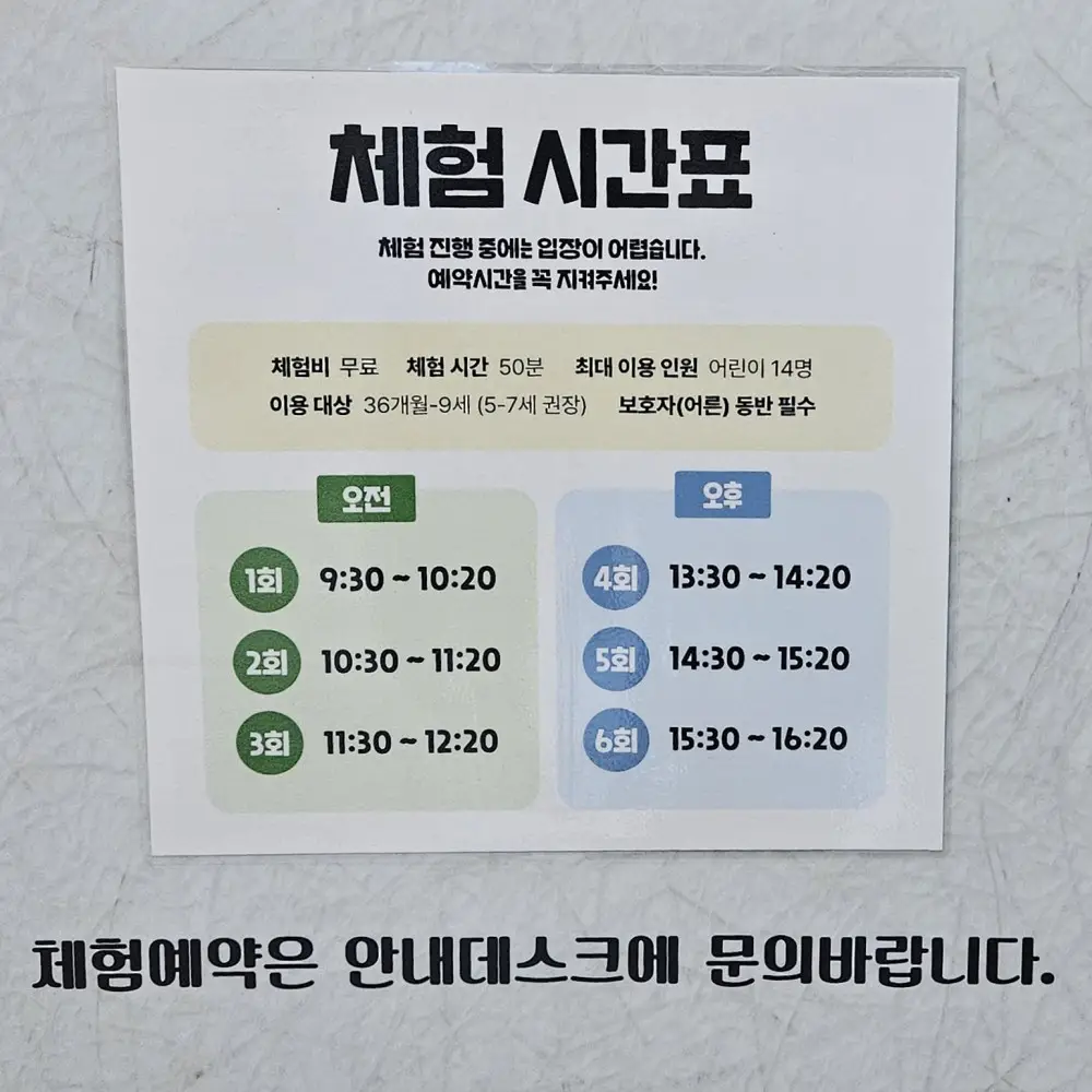 어린이체험실은 회당 14명의 인원으로 운영되며, 보호자 1인 동반이 필수입니다. 체험은 무료로 제공되며, 운영 시간은 오전 9시 30분부터 오후 4시 20분까지 하루 6회 진행됩니다. 인터넷 예약과 현장 접수가 모두 가능하니 방문 전에 예약을 권장드립니다!