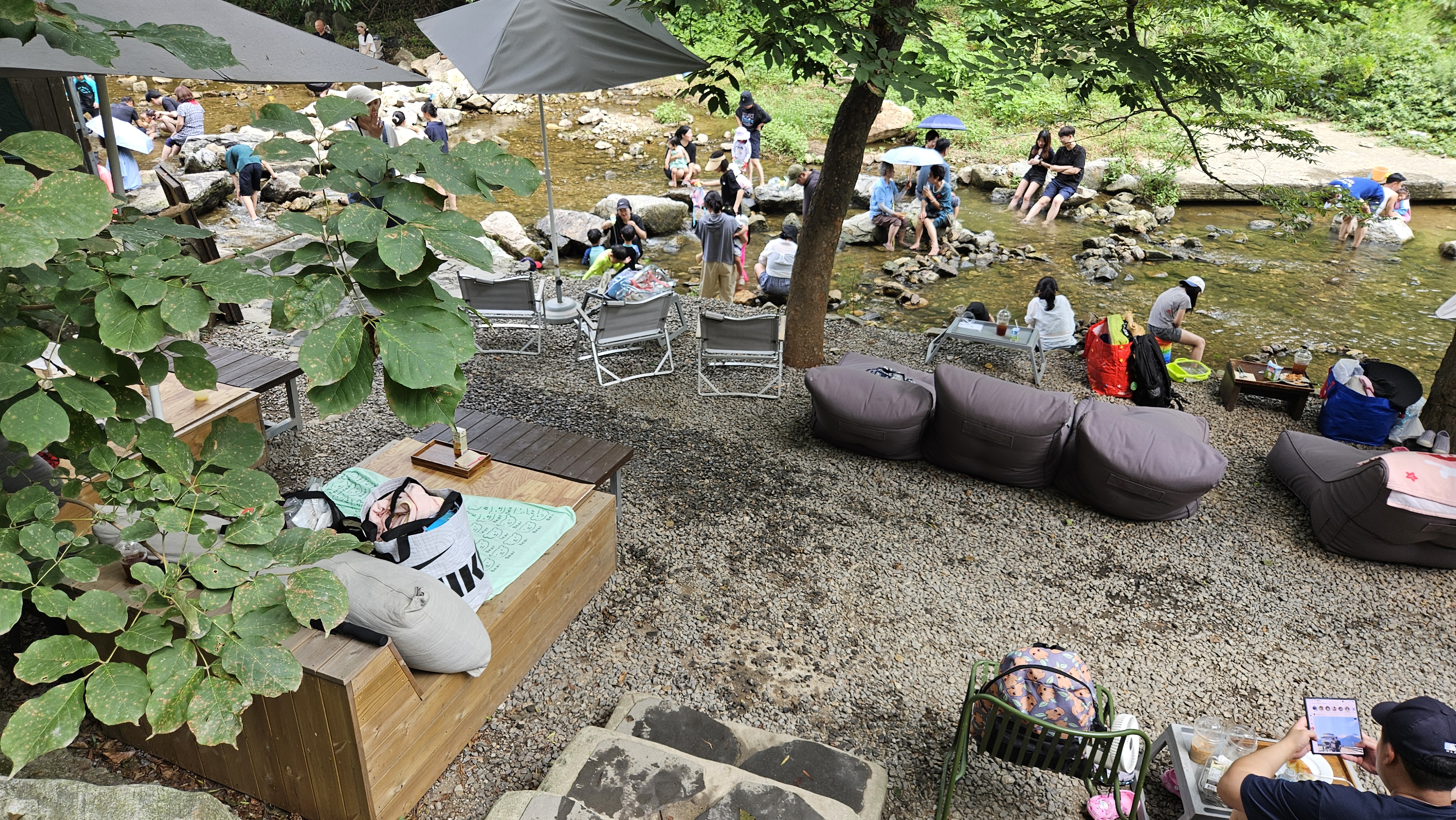 주차장도 그 시간대에 그래도 차량 주차할 곳이 있었고 조금만 오픈 시간이 지나버려도 이중주차로 꽉 차는 것을 보실 수 있습니다. 매장 입장과 동시에 제일 먼저 해야 할 일은 자리 맡기! 특히 자녀와 함께 계곡을 즐길 예정이라면 야외 평상자리가 최고인데, 저희는 직접 경험해 보니 야외로 나가자마자 왼쪽 끝이나 오른쪽 끝 평상을 강력 추천드리고 싶어요.