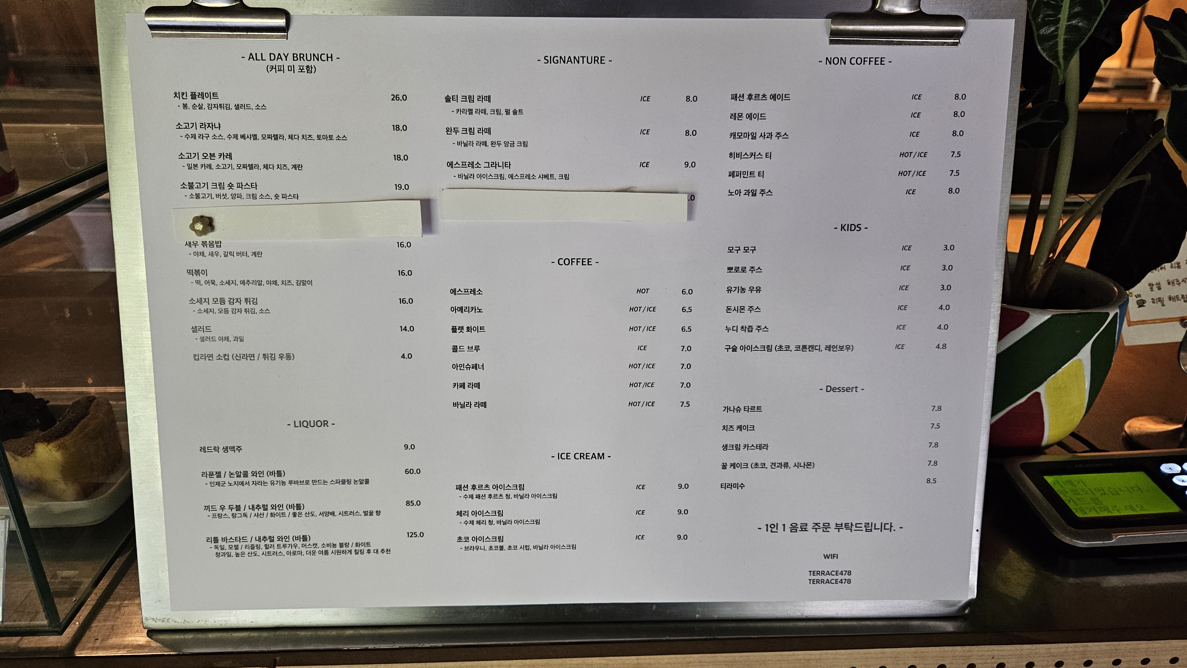 그리고 단순히 ‘계곡 근처 카페’가 아니라 브런치카페로, 브런치류 메뉴도 다양하게 준비되어 있어서 아침, 아점 모두 가능해요. 샌드위치, 샐러드, 파스타, 볶음밥, 카레 등 다양한 메뉴가 있고 아이들도 먹기 부담 없는 맛이라, 일찍 오셔서 자리 맡은 다음 간단하게 브런치로 든든하게 식사하는 가족들이 많더라고요. 저희는 음료 위주로 주문했지만, 한 켠에서는 아침 식사 겸 브런치를 즐기는 가족들이 여럿 보였어요. 특히 아이가 어릴 때는 아침을 꼭 먹여야 하는 부모 마음, 다들 공감하시죠. 카페 메뉴 외에도 가까이에 백숙집도 있어서, 계곡에서 놀고 나와 든든하게 한 끼 해결할 수 있는 점도 정말 만족스러웠습니다!