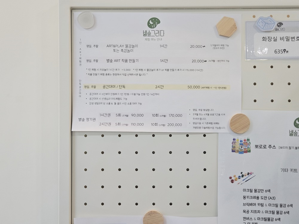 슬라임체험을 진행하고 선생님께서 액자를 만들어주시는 동안 놀이방에서 재미있게 놀았어요. 별숲그리다는 미술 체험 외에도 이렇게 원목 장난감과 주방놀이 등 다양한 놀이공간이 마련되어 있어 좋더라고요. 곳곳에 포토존도 마련되어 있어서 이쁜 사진도 찍을 수 있었습니다.