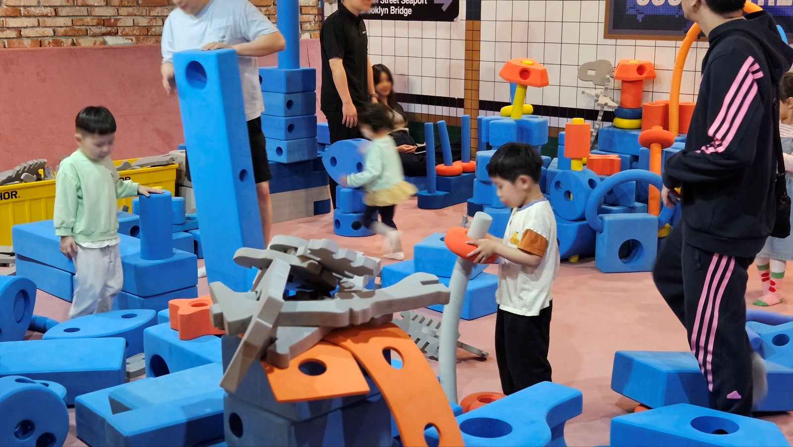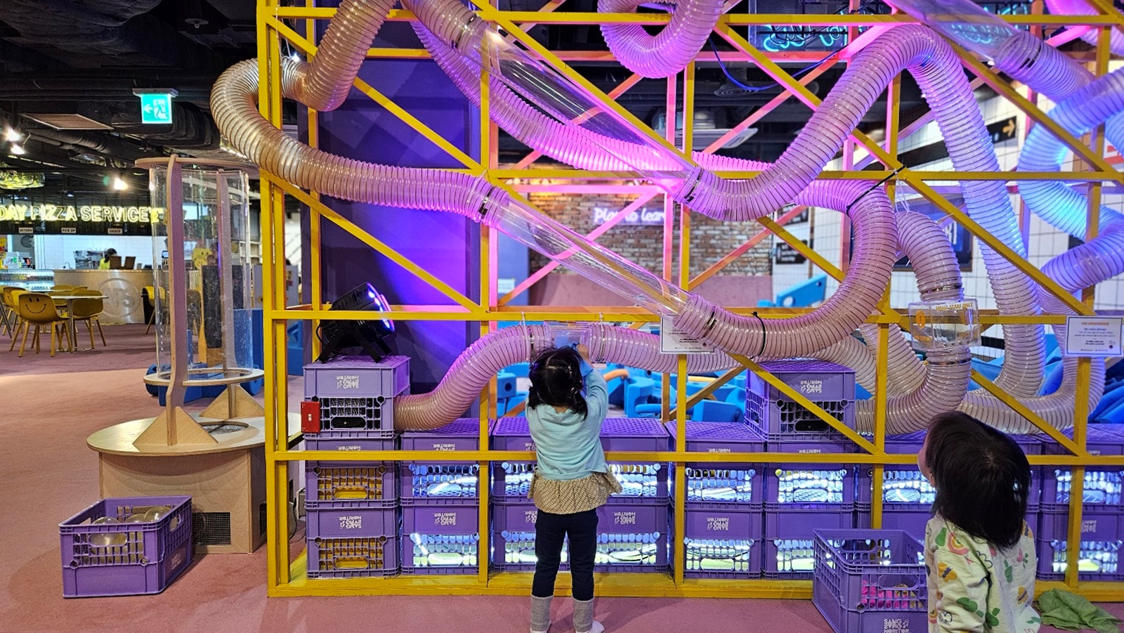 다른 키즈카페와 좀 달라 보이는 부분이 장난감을 가지고 상상력 있게 아이들이 놀 수 있는 공간이 많아 좋았습니다. 물론 체력을 소진할 수 있는 볼풀, 트램펄린 등의 존도 있지만 그 외에 자석블록 이라던지 천을 날리는 바람을 이용한 기구라던지 어린이박물관에서 보았던 기구를 키즈카페에서 볼 줄은 몰랐습니다.