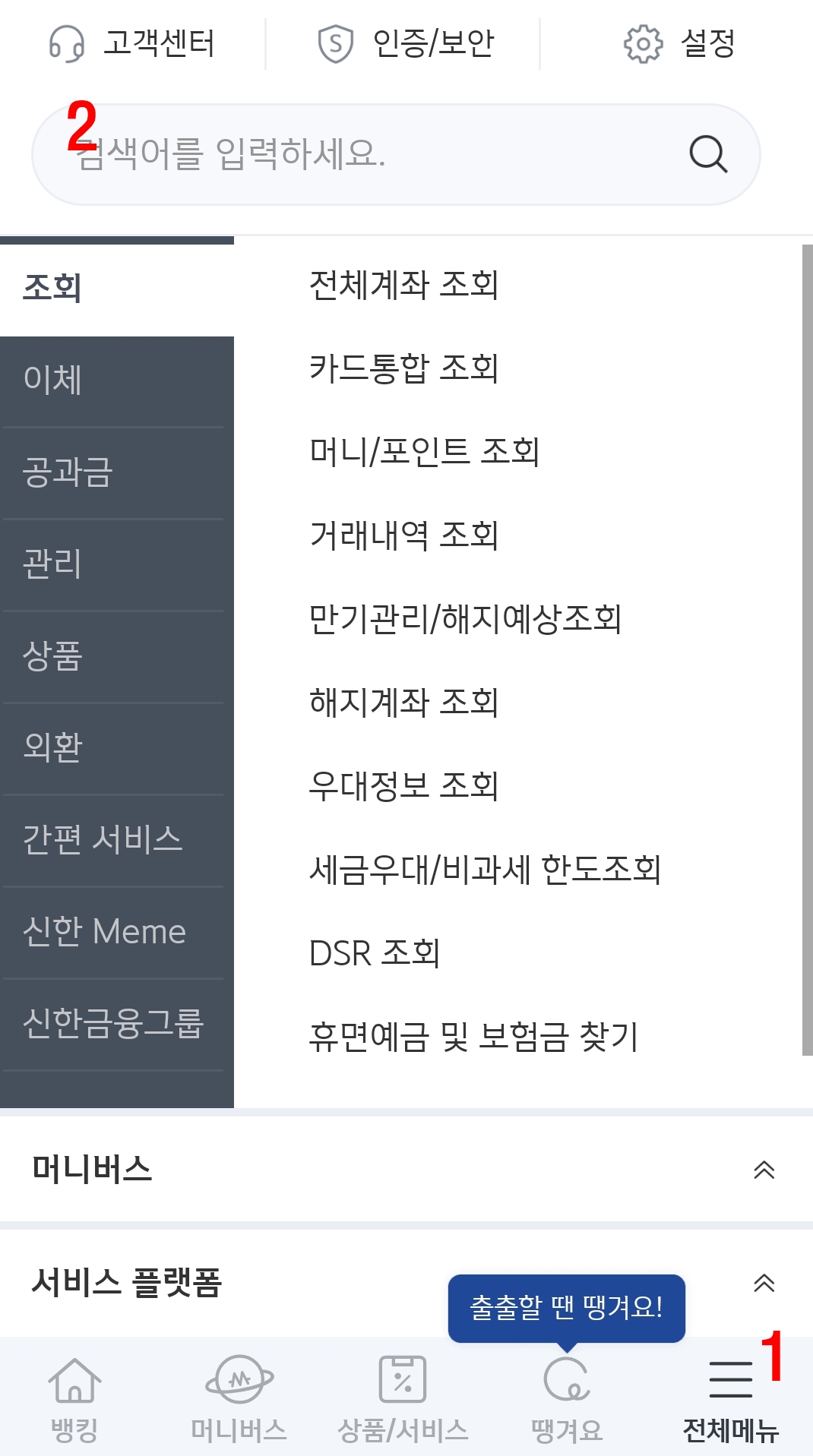 먼저 쏠 어플을 실행해 줍니다. 쏠 어플이 핸드폰에 설치되어있지 않다면 설치해 주셔야지만 수수료 면제 혜택을 받을 수 있습니다. 어플실행 후 로그인하여 위와 같이 우측 하단 전체 메뉴를 클릭 후 검색창에 '전환'이라고 검색을 해주세요.