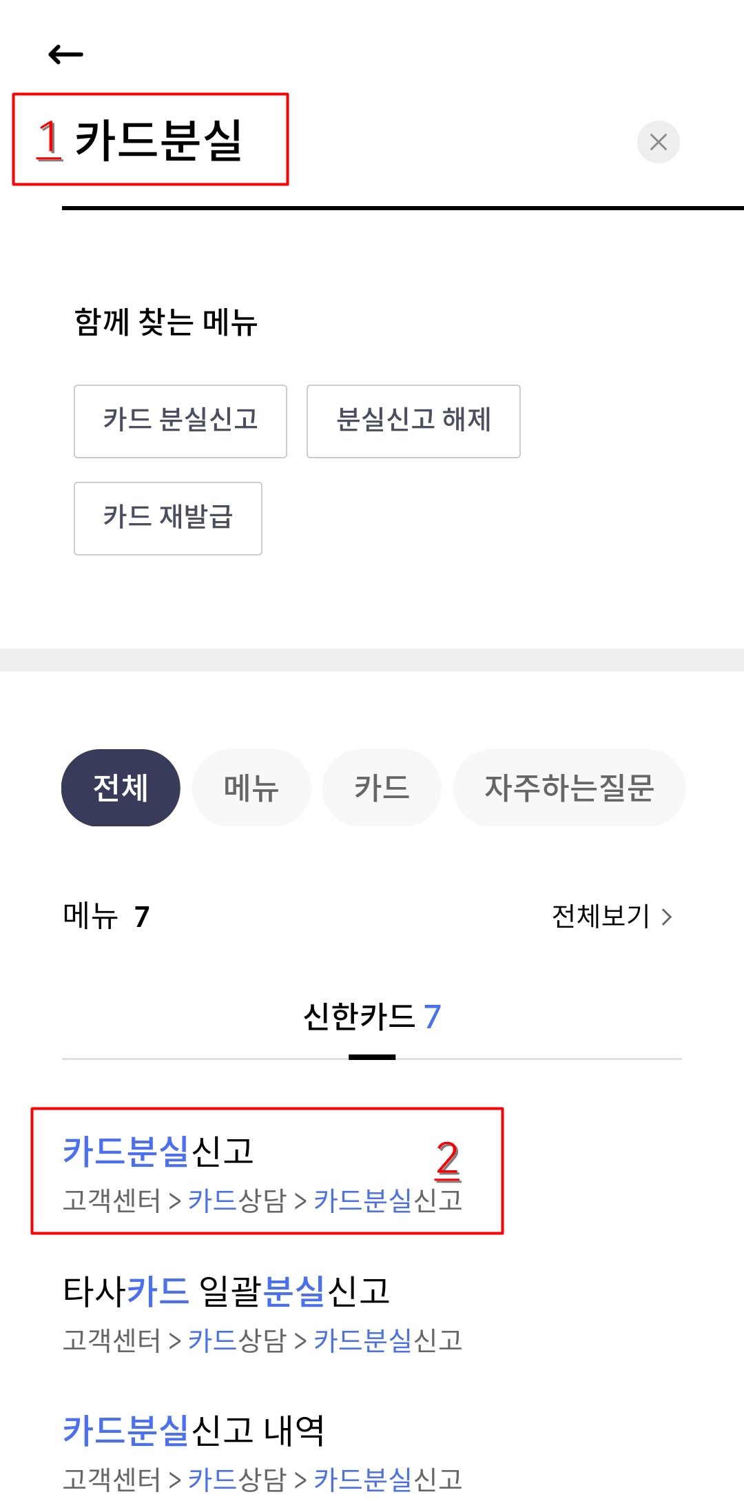 2) 위와 같이 검색창이 활성화되었으면 검색란에 [카드분실]로 검색을 해 주시면 위 이미지의 아래 빨간 박스로 표기한 것처럼 [카드분실신고] 카테고리가 뜨며 클릭해주시면 바로 원클릭으로 해당 메뉴로 들어가실 수 있습니다.