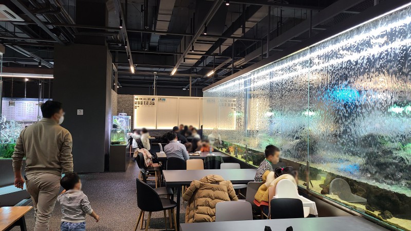 내부가 넓습니다. 생각한 거보다 매우 넓어서 놀랐습니다. 저희 집 근처에 어푸어푸라는 수족관카페가 있는데 집 근처에 있다 보니 시설도 깨끗해서 종종 가거든요. 그런데 그에 비해 리빙파워센터 아쿠아가든은 작은 수족관카페가 아니라 이정도면 초대형 아쿠아리움 카페라고 해도 될 만큼 굉장히 넓은 규모였어요.