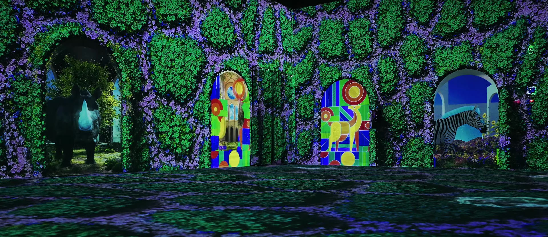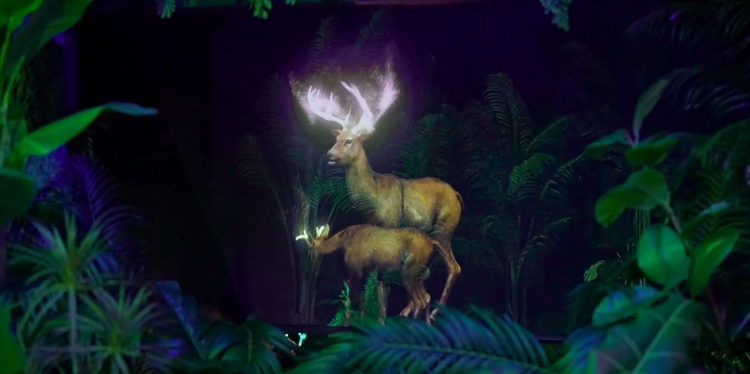 - 풀들과 넝쿨이 무성한 정글 사이로 신비로운 동물들을 미디어로 만날 수 있는 공간 '글로우정글'