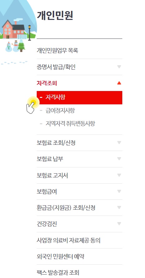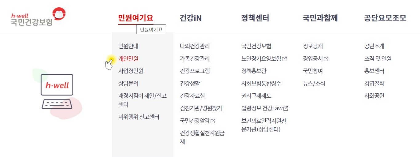 2) 국민건강보험 홈페이지에서 이 위 이미지와 같이 [민원여기요] - [개인민원]을 클릭하여 줍니다.