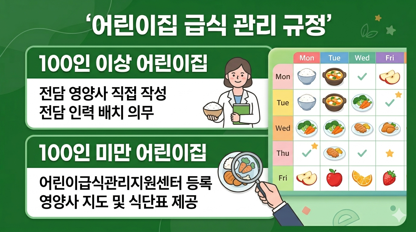| 영유아 100명 미만 어린이집 | 어린이급식관리지원센터에 등록 후 영양사 지도 하에 식단 작성 또는 센터 표준 식단 활용 |
