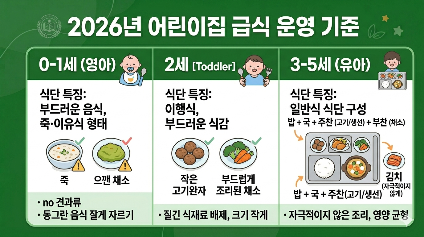 어린이집 식단표는 무작위로 정해지는 것이 아닙니다. 「영유아보육법」과 보건복지부 보육사업안내 기준에 따라 연령별 영양 기준에 맞게 작성되어야 하며, 알레르기 유발식품은 반드시 표시되어야 합니다. 이 글에서 어린이집 식단표의 구성 원칙, 연령별 차이, 부모가 확인하는 방법, 알레르기 대응 방법까지 2026년 최신 기준으로 정리해 드립니다.