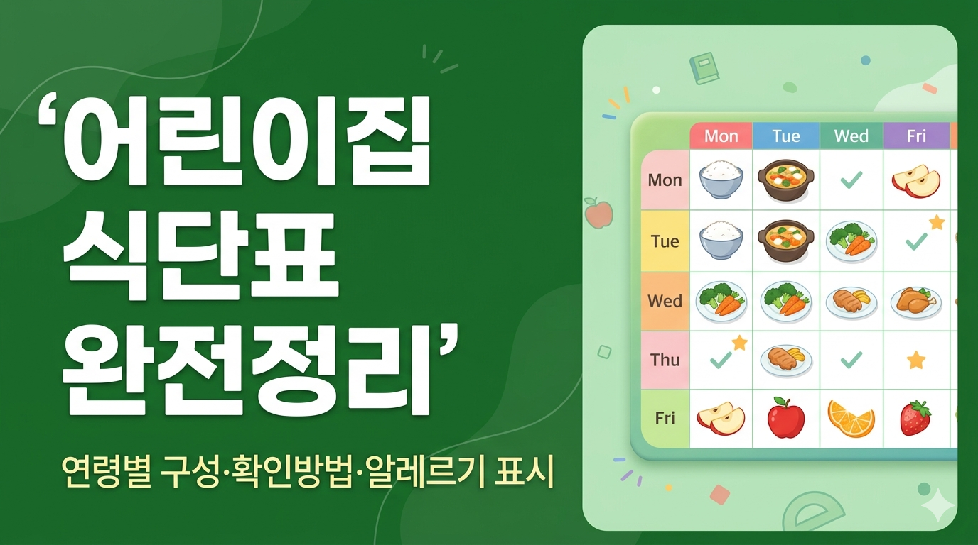 어린이집 식단표는 단순한 메뉴 안내가 아닙니다. 영유아보육법과 보건복지부 2026년 보육사업안내 기준에 따라 연령별 영양 기준에 맞게 작성되어야 하고, 알레르기 유발식품을 의무적으로 표시해야 하는 공식 문서입니다. 아이를 어린이집에 보낼 때 식단표를 꼼꼼히 살펴보고, 자녀의 알레르기 정보를 담당 교사에게 사전에 충분히 전달해 두세요.