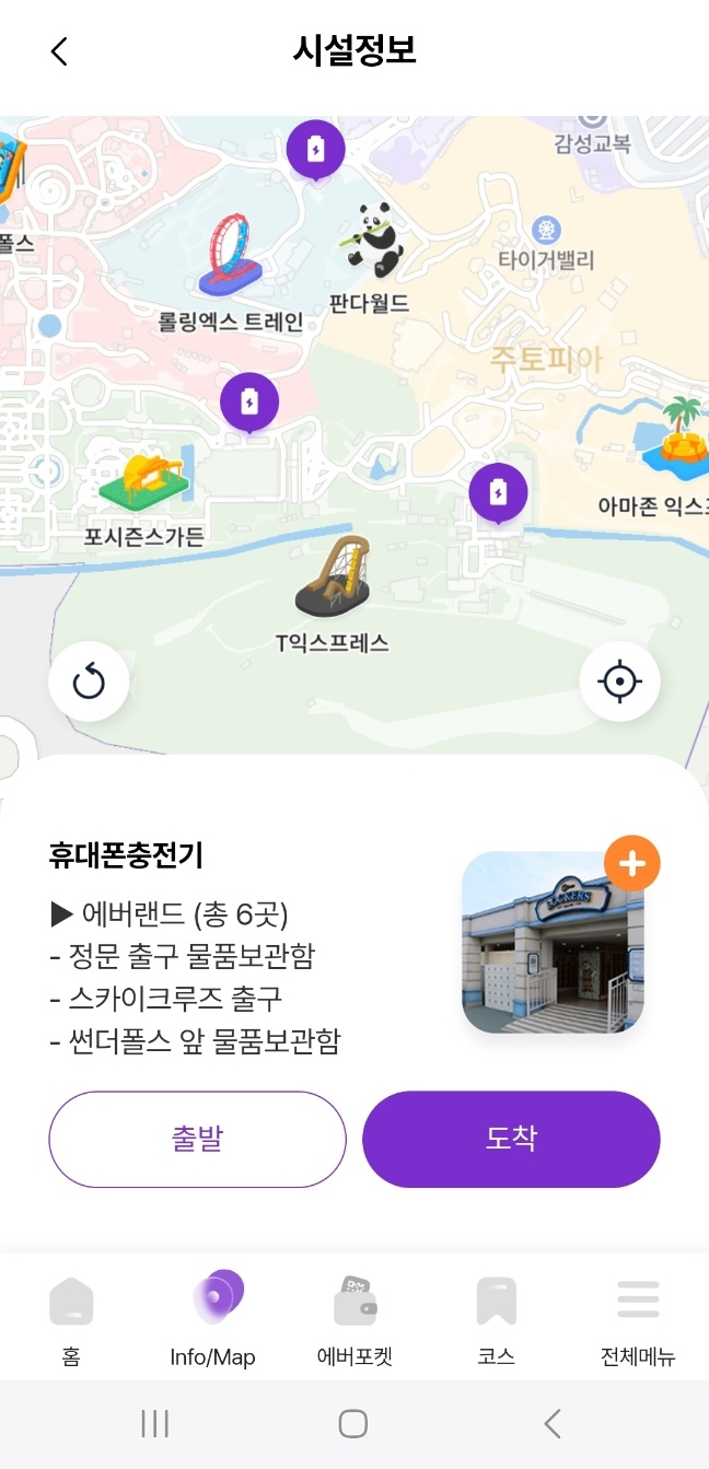 - 지도상에 에버랜드 핸드폰충전 가능한 곳이 표시가 될 텐데요. 아래 도착버튼을 눌러서 길을 찾아가셔서 이용하시면 됩니다.