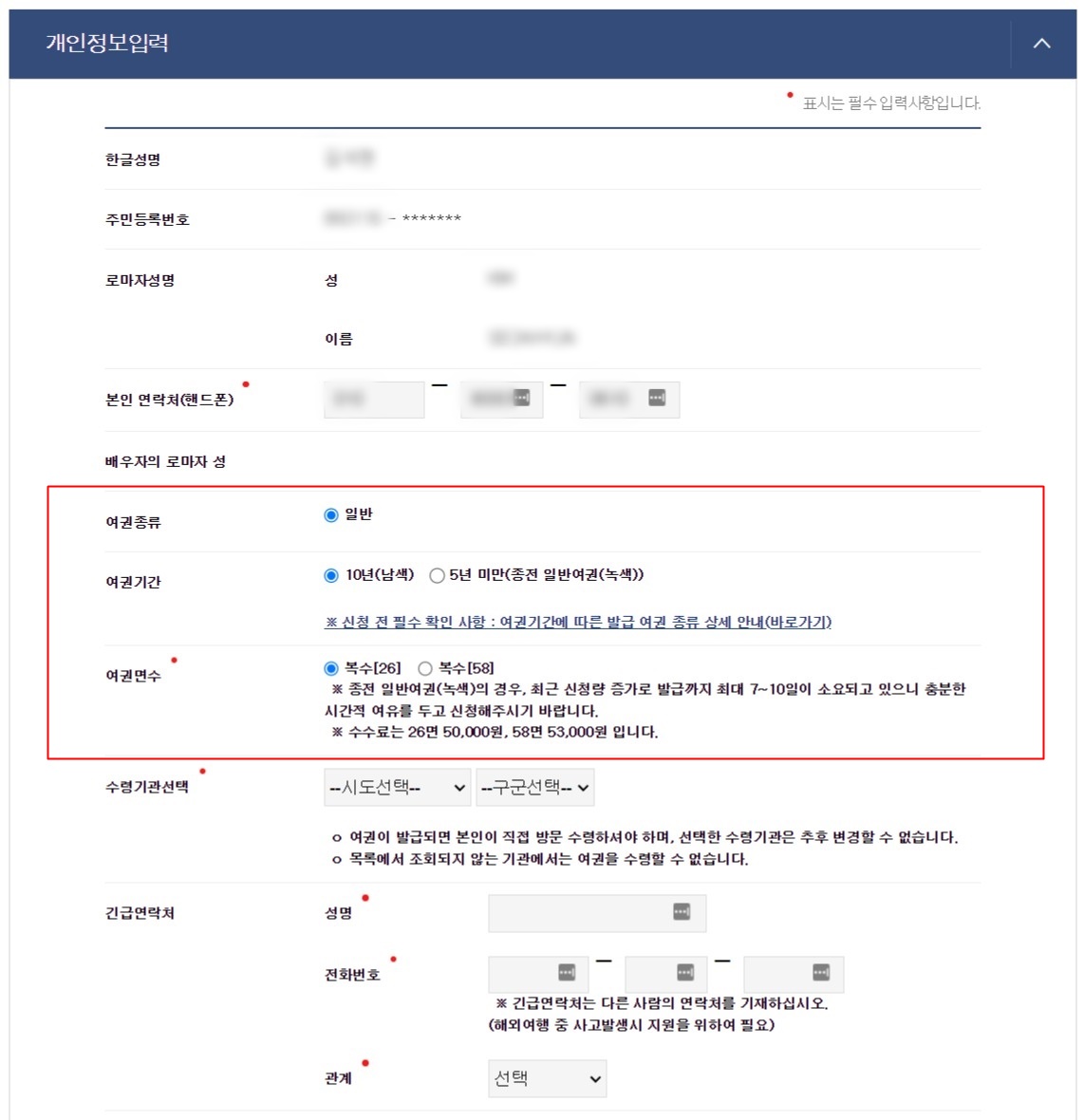 2) 진행하다 보면 여권의 종류의 선택란이 나오는데 위 이미지에 박스 친 부분에 선택된 답이 제일 가격대비 성능이 좋은 여권이니 참고하시면 될 것 같습니다. 26장보다는 3천 원에 58장으로 하시는 것이 더 이득입니다.